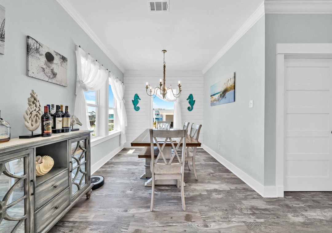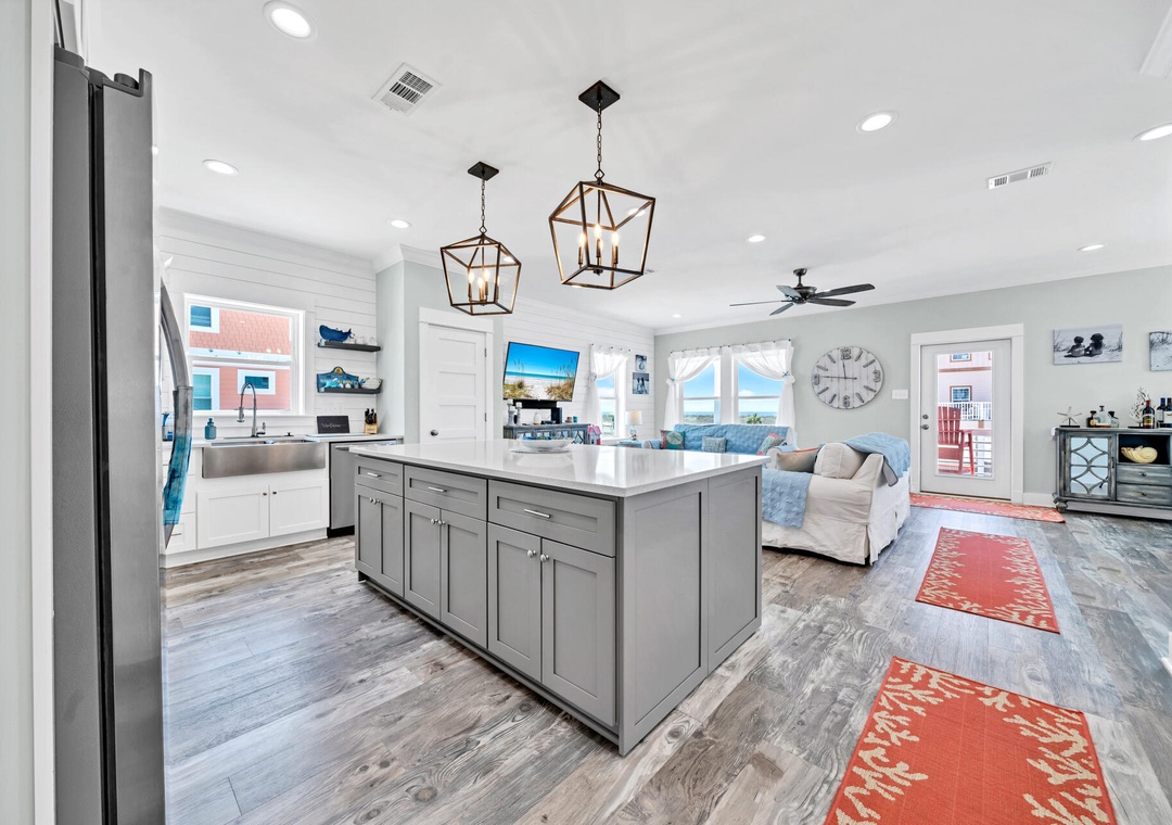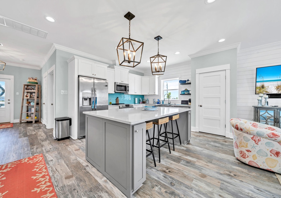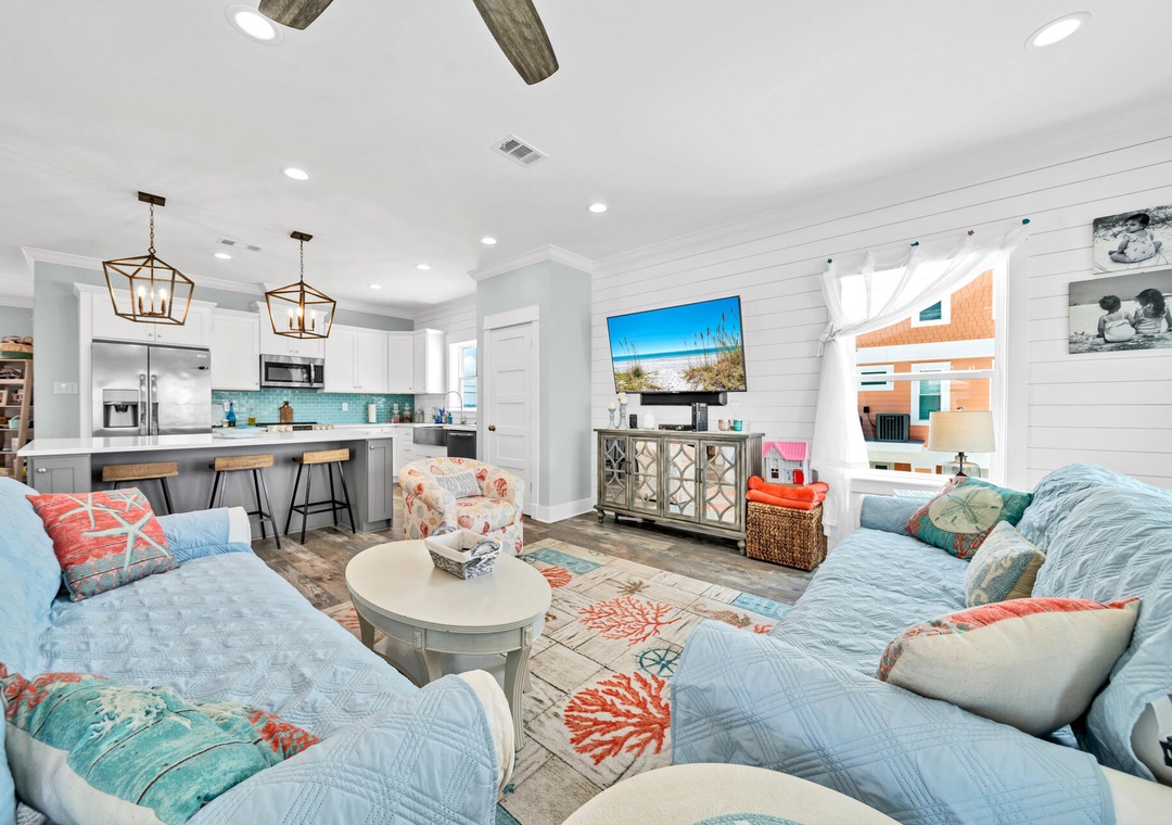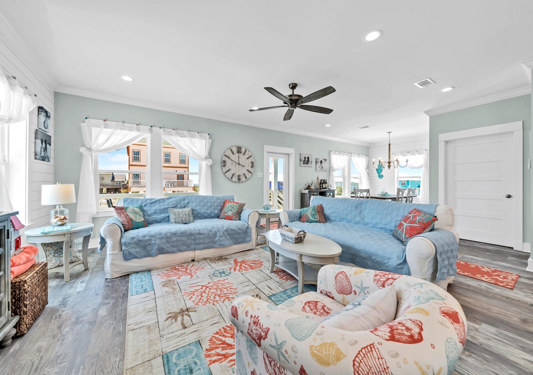 Inside, an airy open floor plan welcomes you, adorned with expansive windows that invite abundant natural light and offer sweeping vistas of the azure waters from every angle. Plenty of comfortable seating allows for the ultimate relaxation whether watching TV, reading a book, or having a game night with your group.