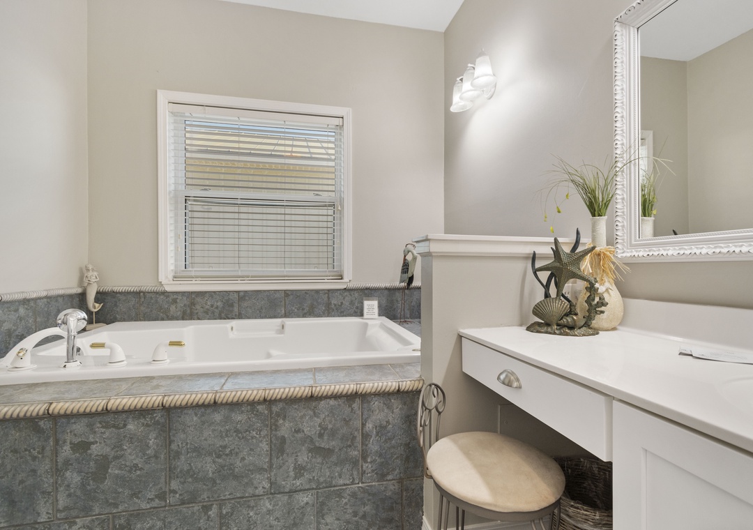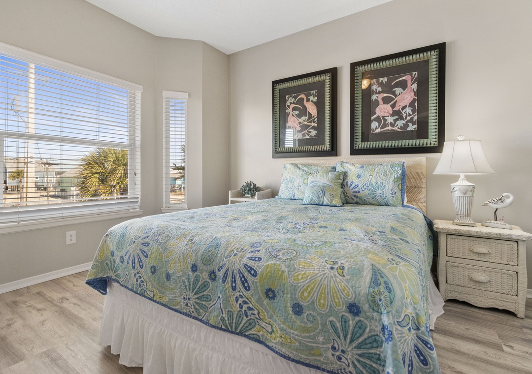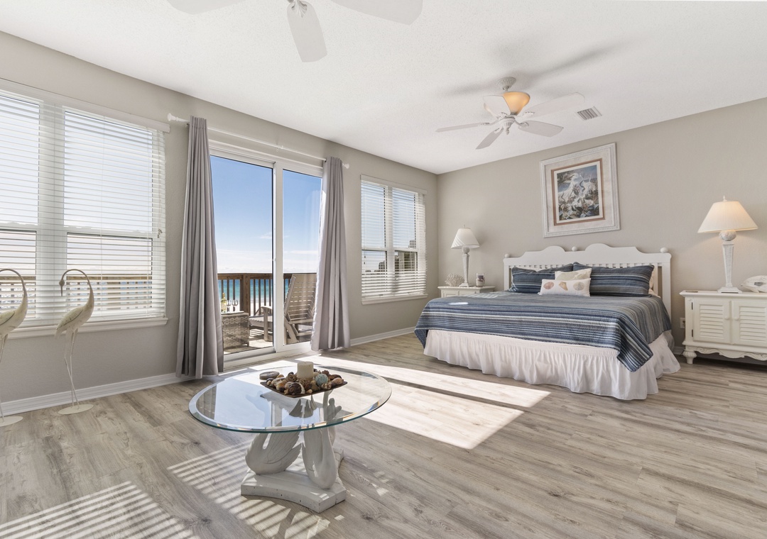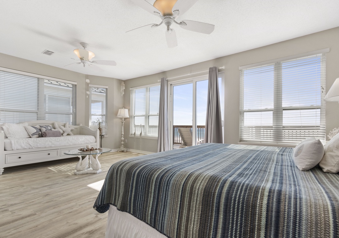 Upstairs is the king-sized primary bedroom with a daybed and private Gulf front balcony. There is also a wet bar with fridge so you can enjoy your first cup of coffee or a night cap at day's end in the privacy of your bedroom. The ensuite bath features a Jacuzzi tub, walk-in shower and private water closet.