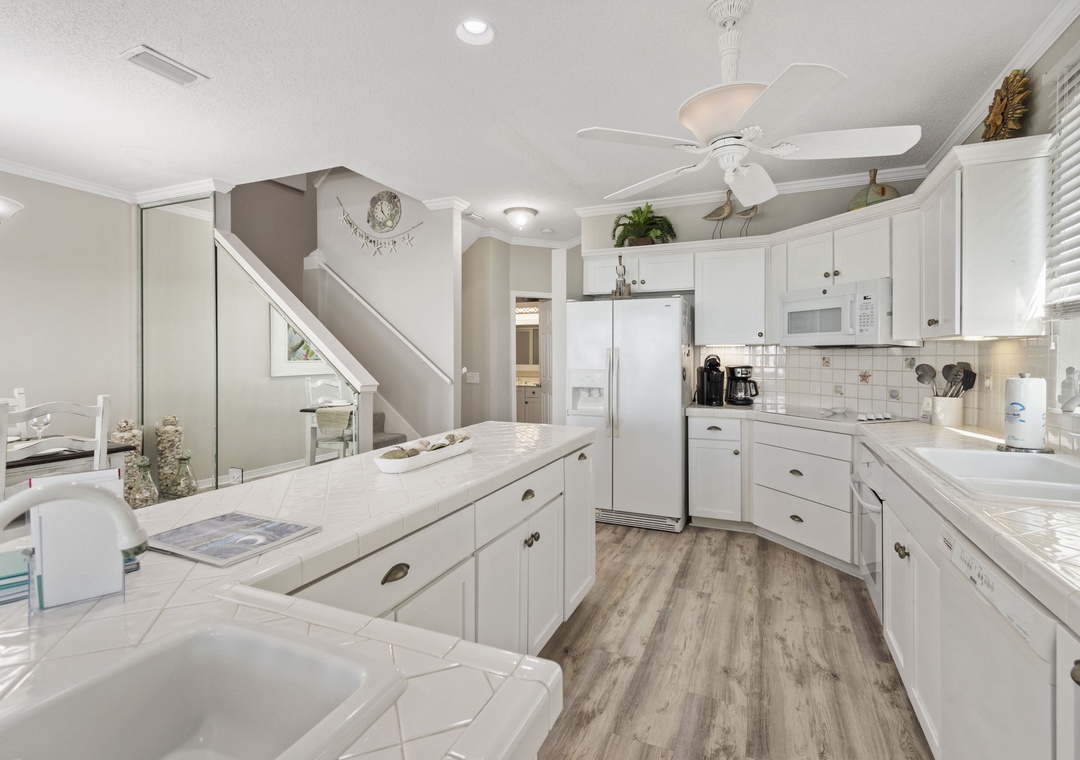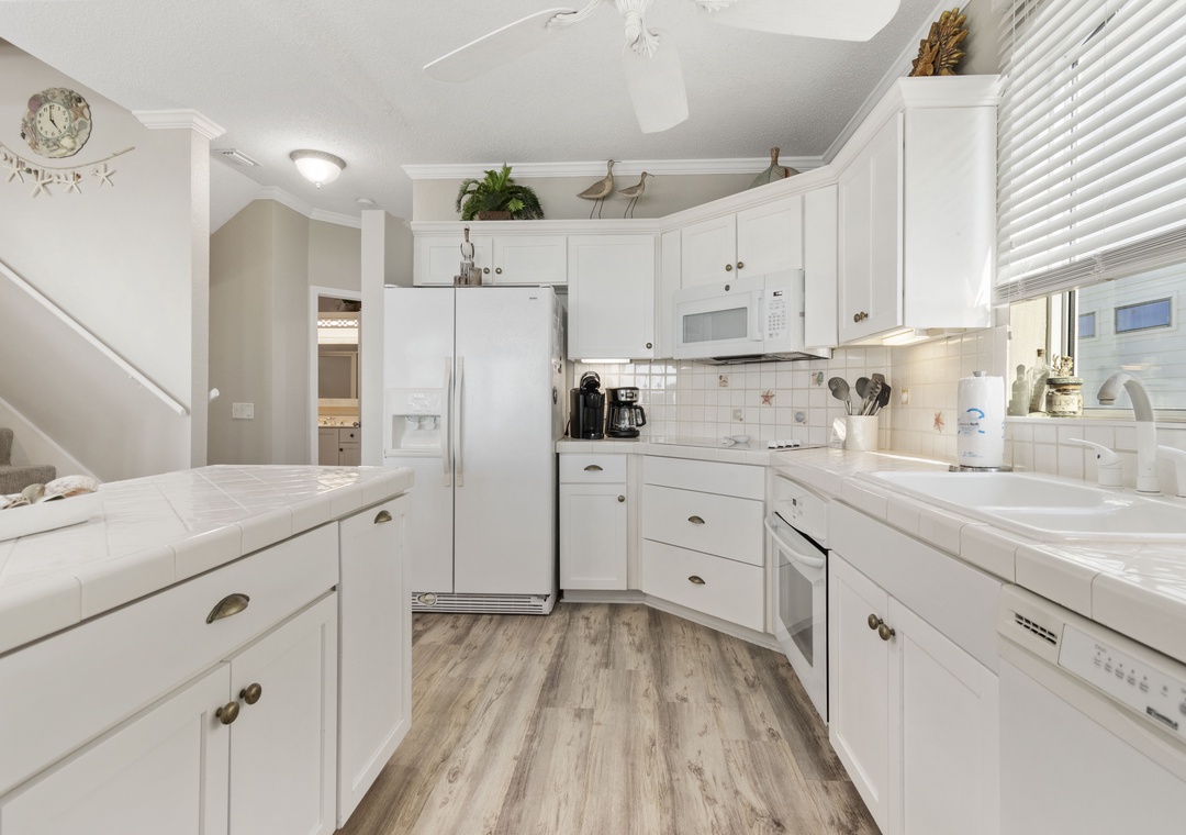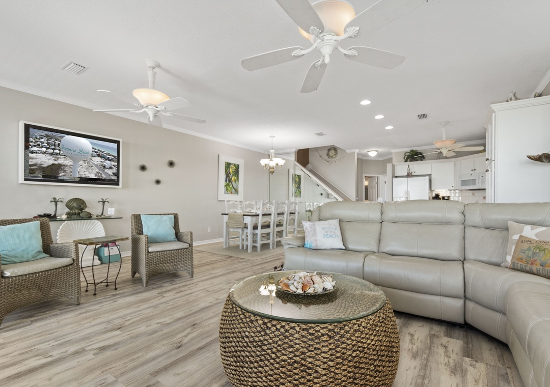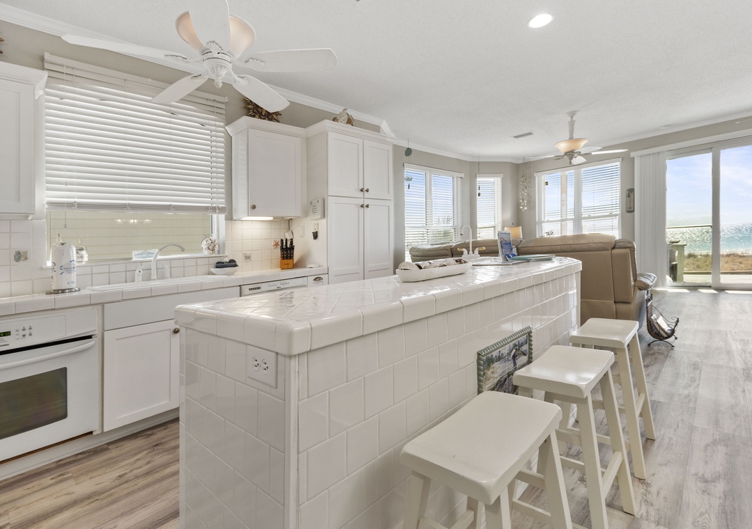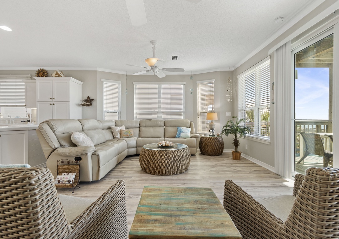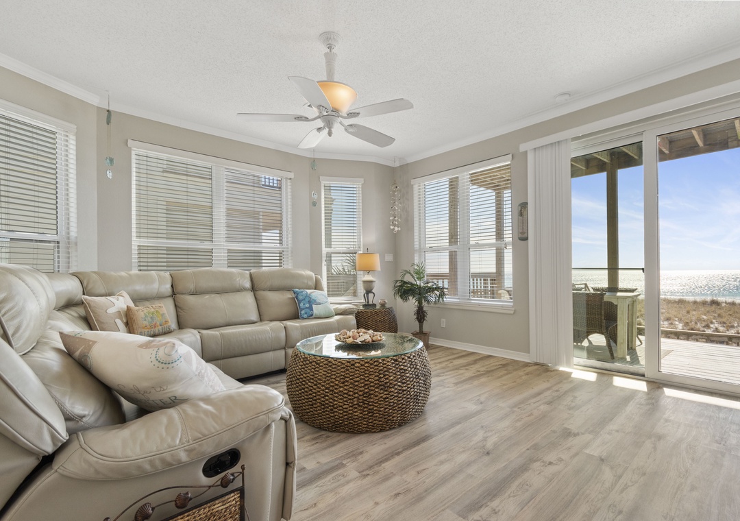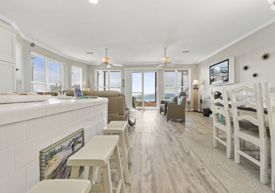 The open concept floor plan features comfortable seating for TV or Gulf viewing, a dining area seating 6, breakfast bar seating 3 and a well equipped kitchen. The main floor also has a queen-sized bedroom and full bath with walk-in shower.