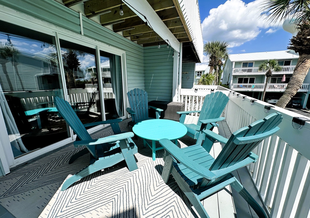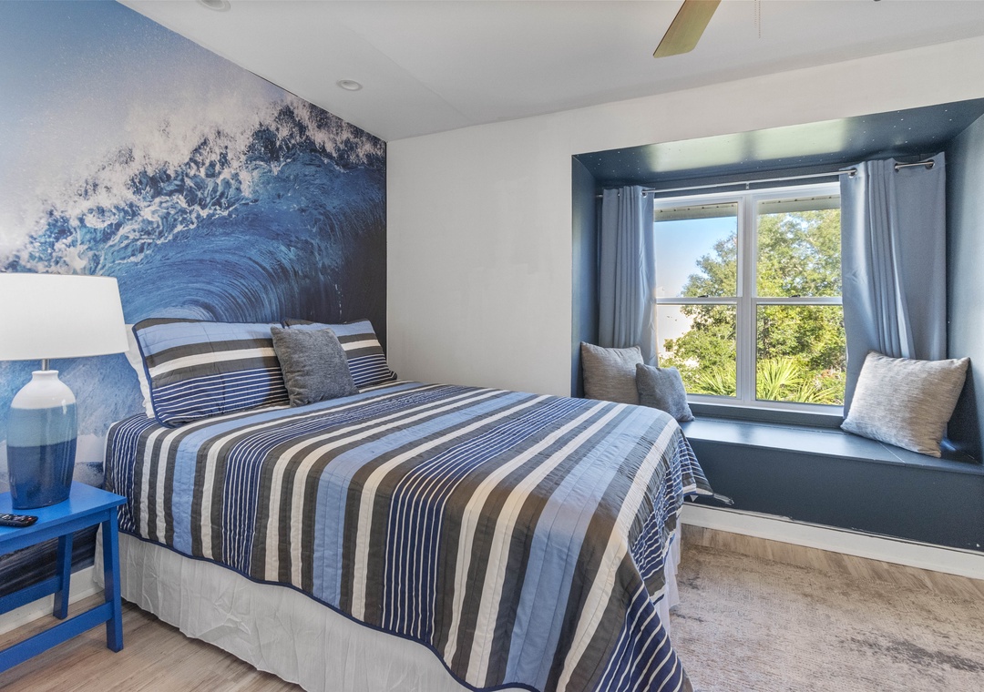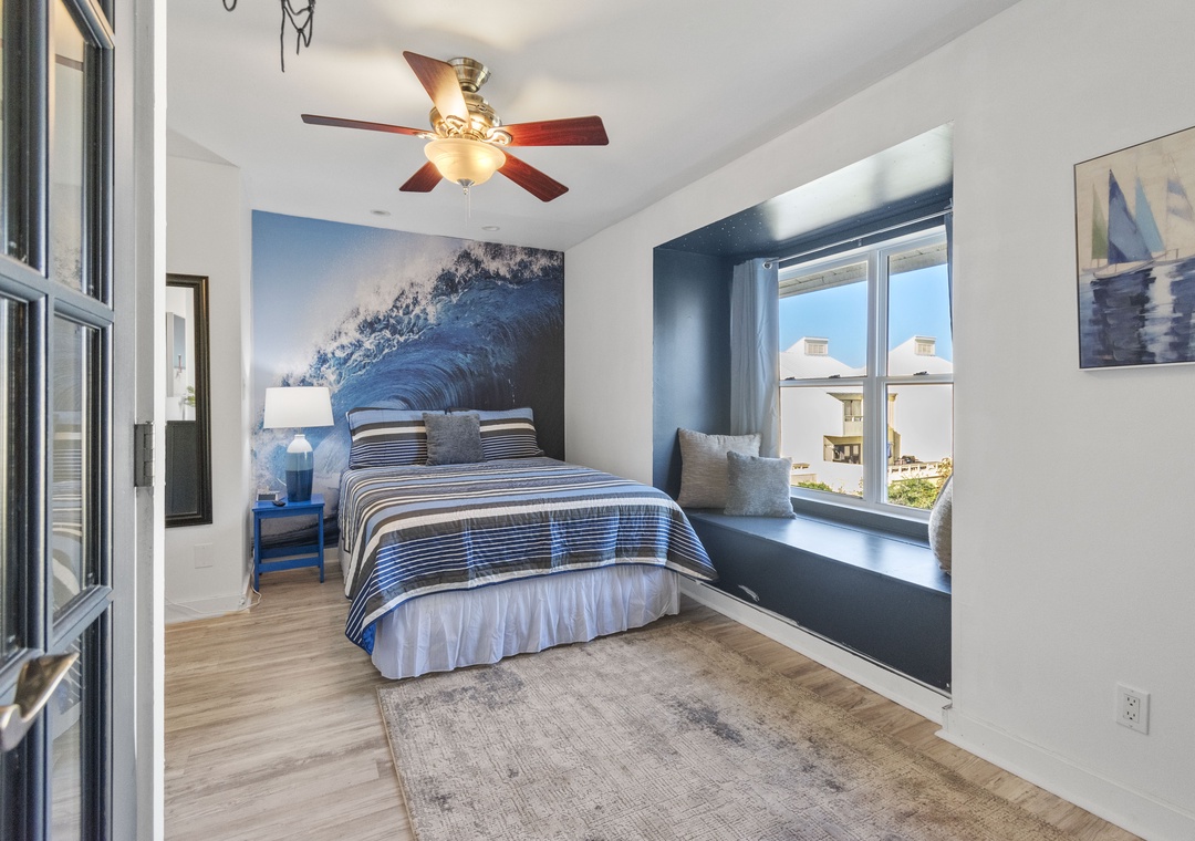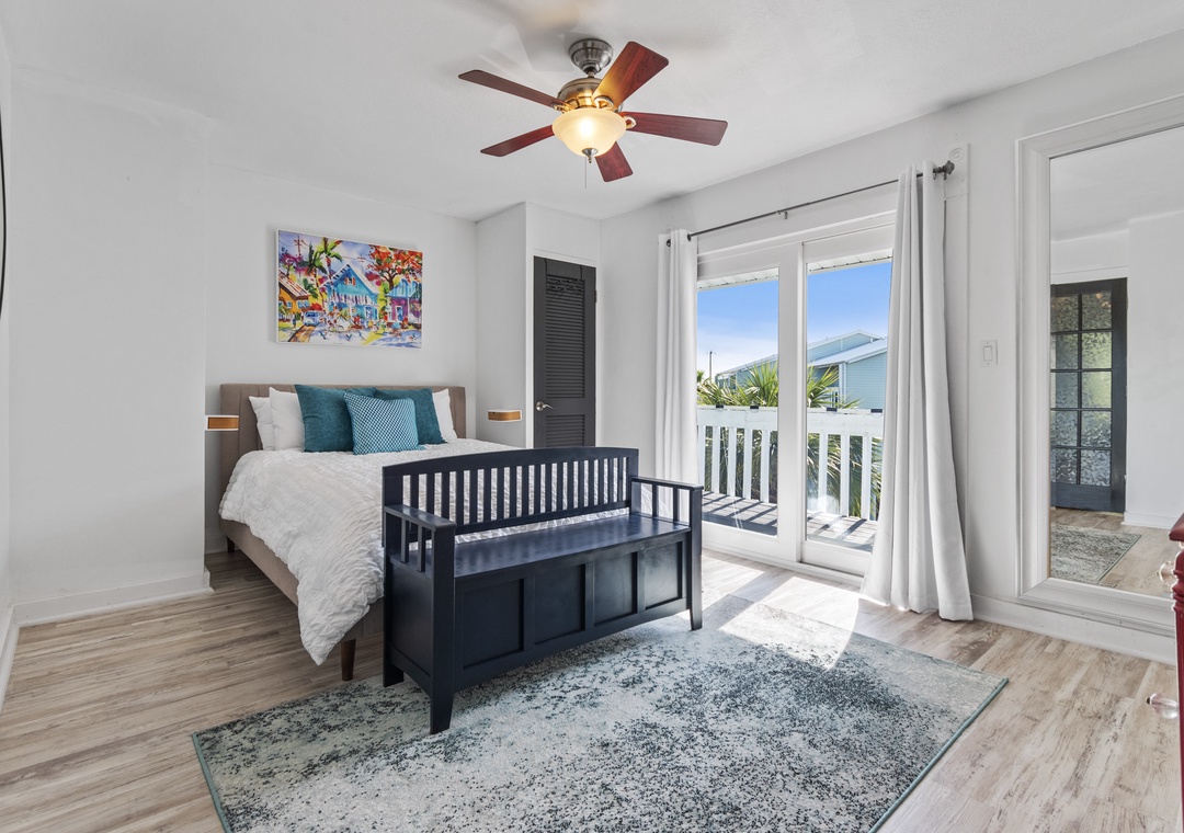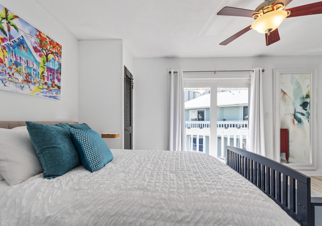 Up one flight is the queen-sized primary with a private balcony. Down the hall is a another queen-sized bedroom. The third bedroom has a trundle bed that will sleep 2 more. A full bath with walk-in shower completes this floor.