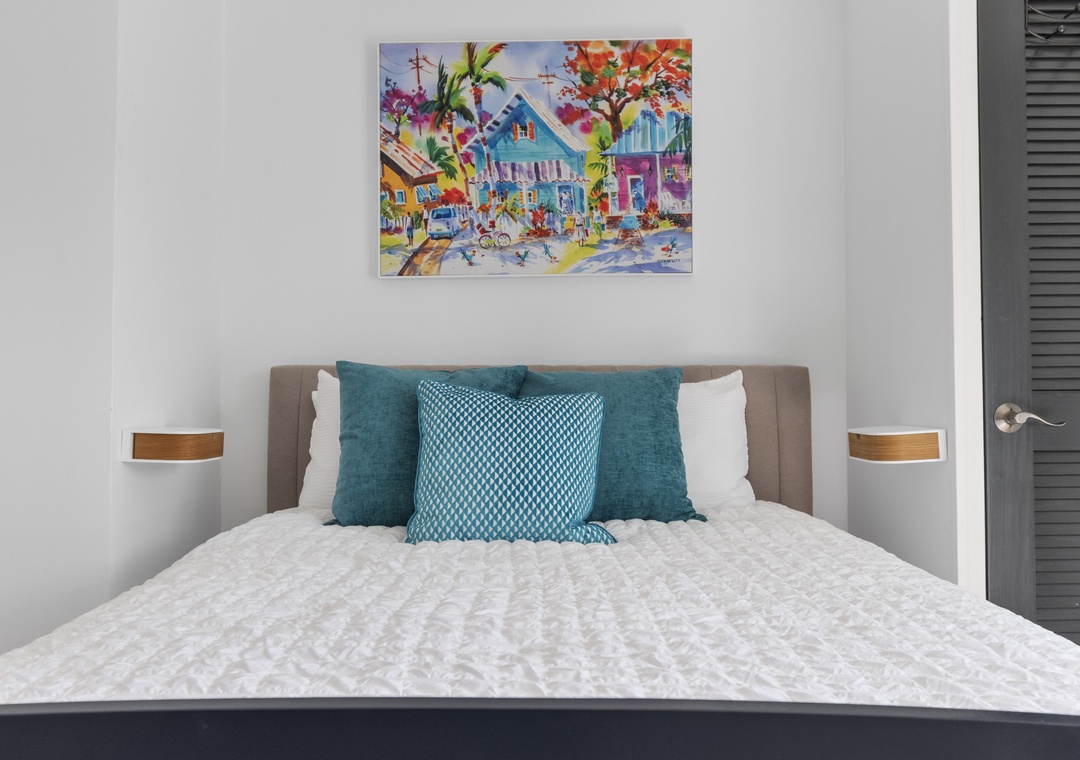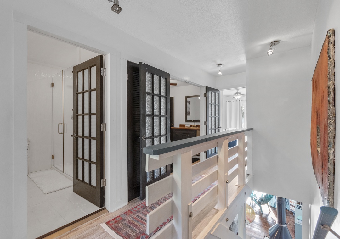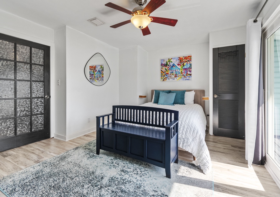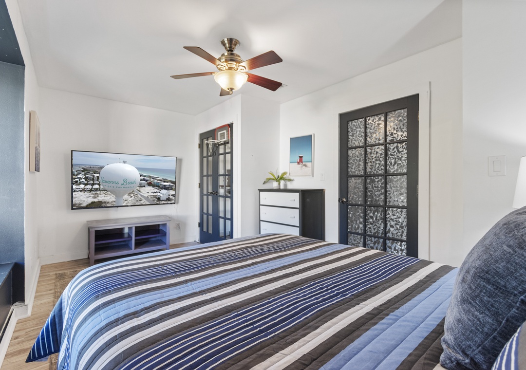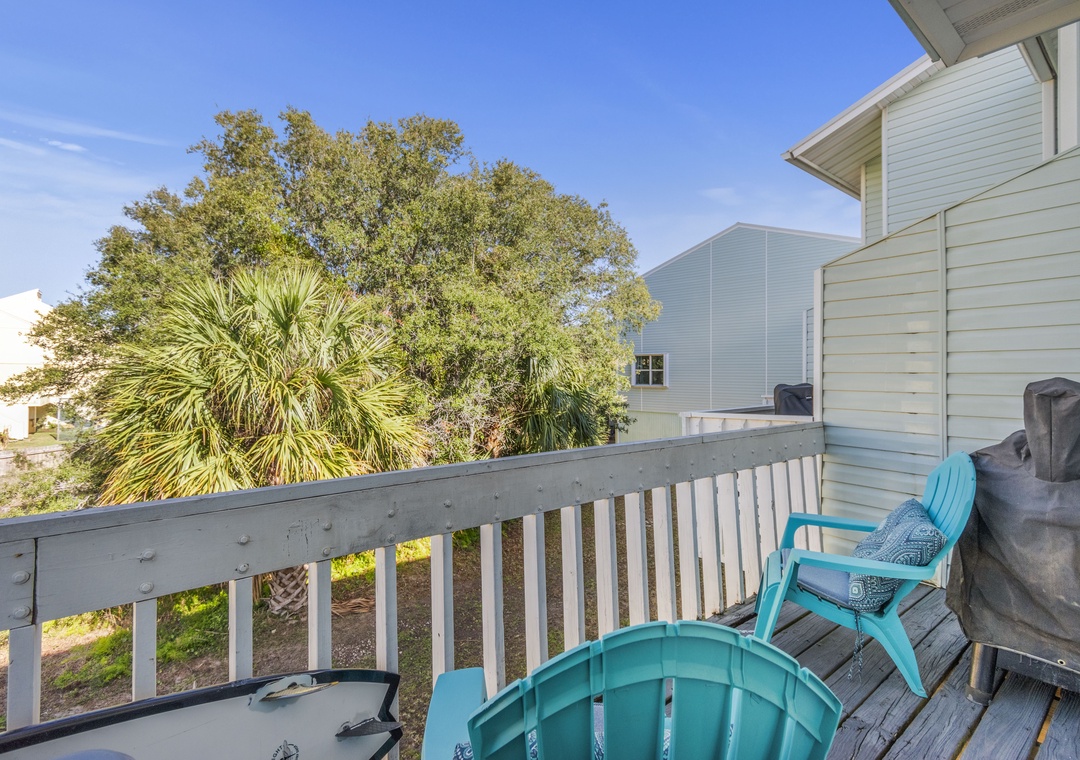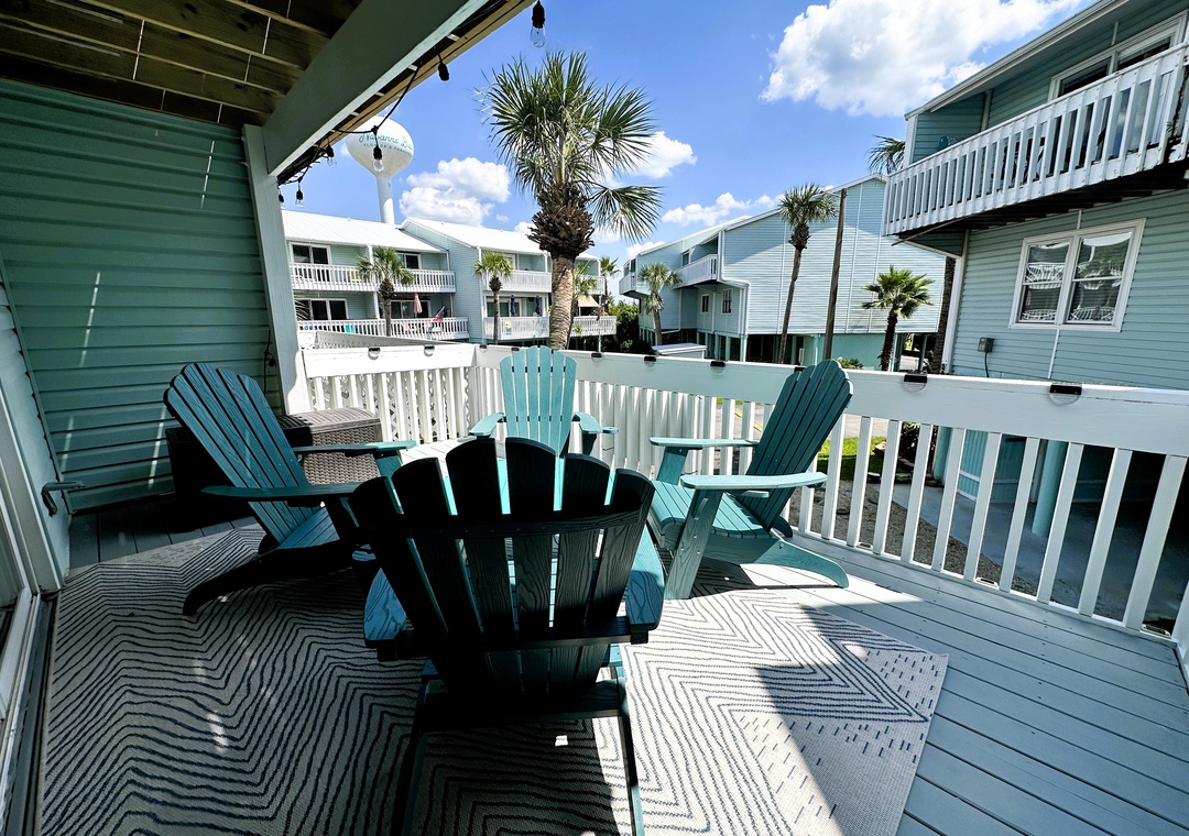 Up one flight is the queen-sized primary with a private balcony. Down the hall is a another queen-sized bedroom. The third bedroom has a trundle bed that will sleep 2 more. A full bath with walk-in shower completes this floor.