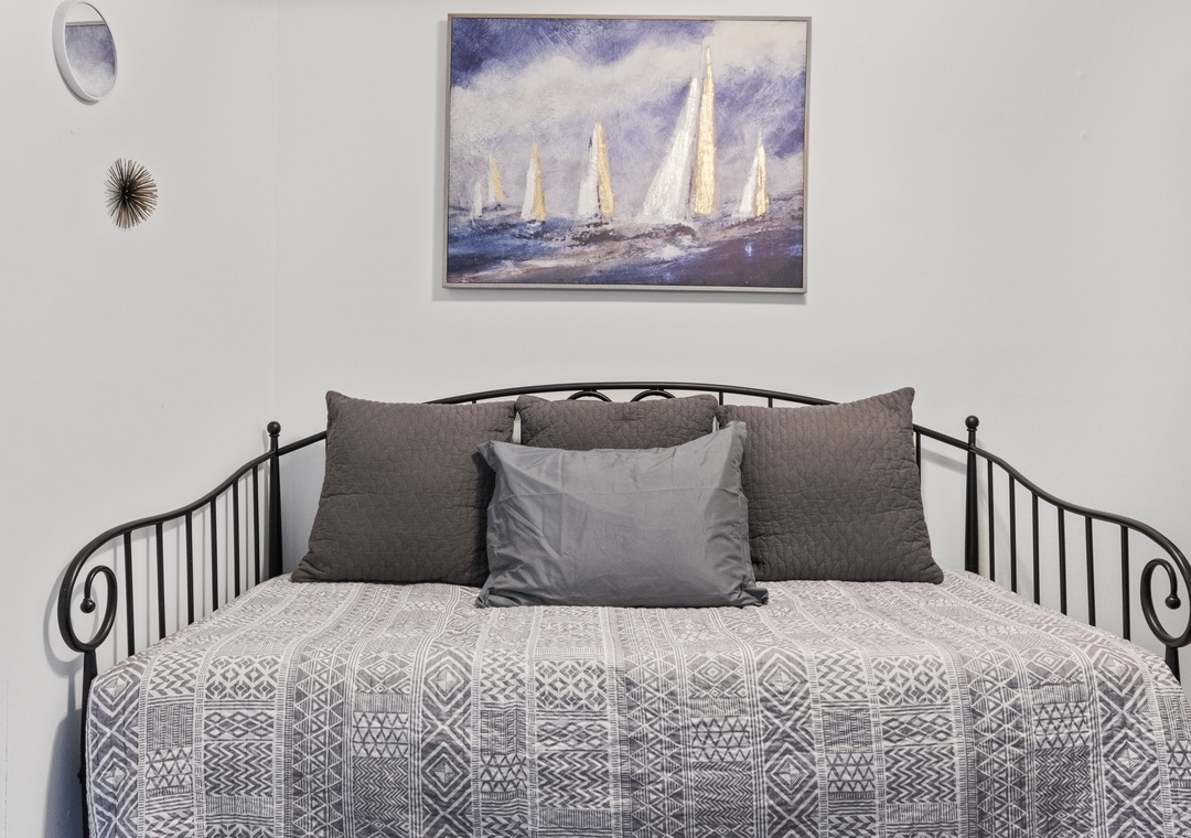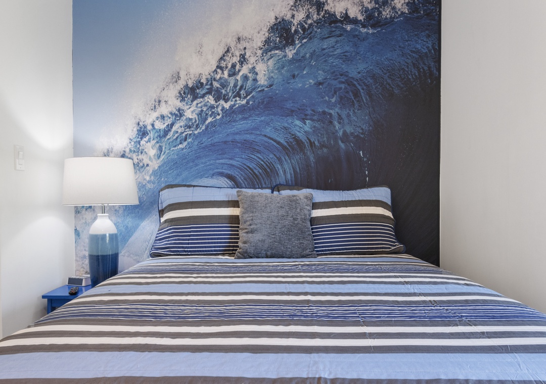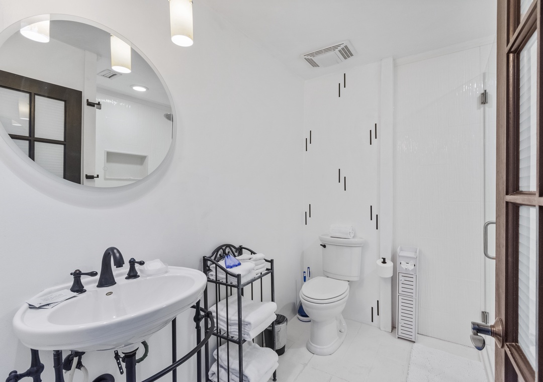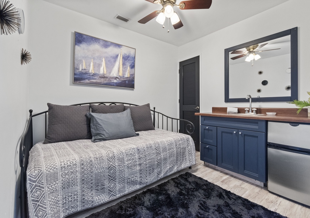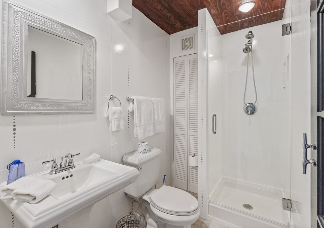 Up one flight is the queen-sized primary with a private balcony. Down the hall is a another queen-sized bedroom. The third bedroom has a trundle bed that will sleep 2 more. A full bath with walk-in shower completes this floor.