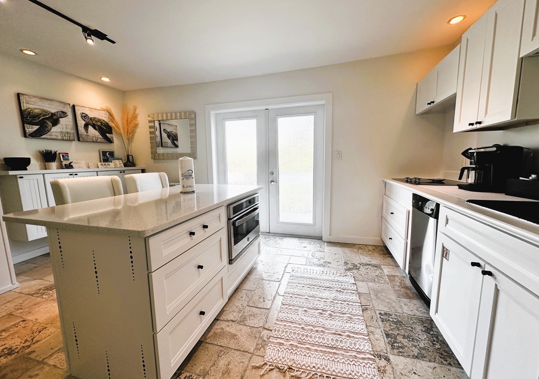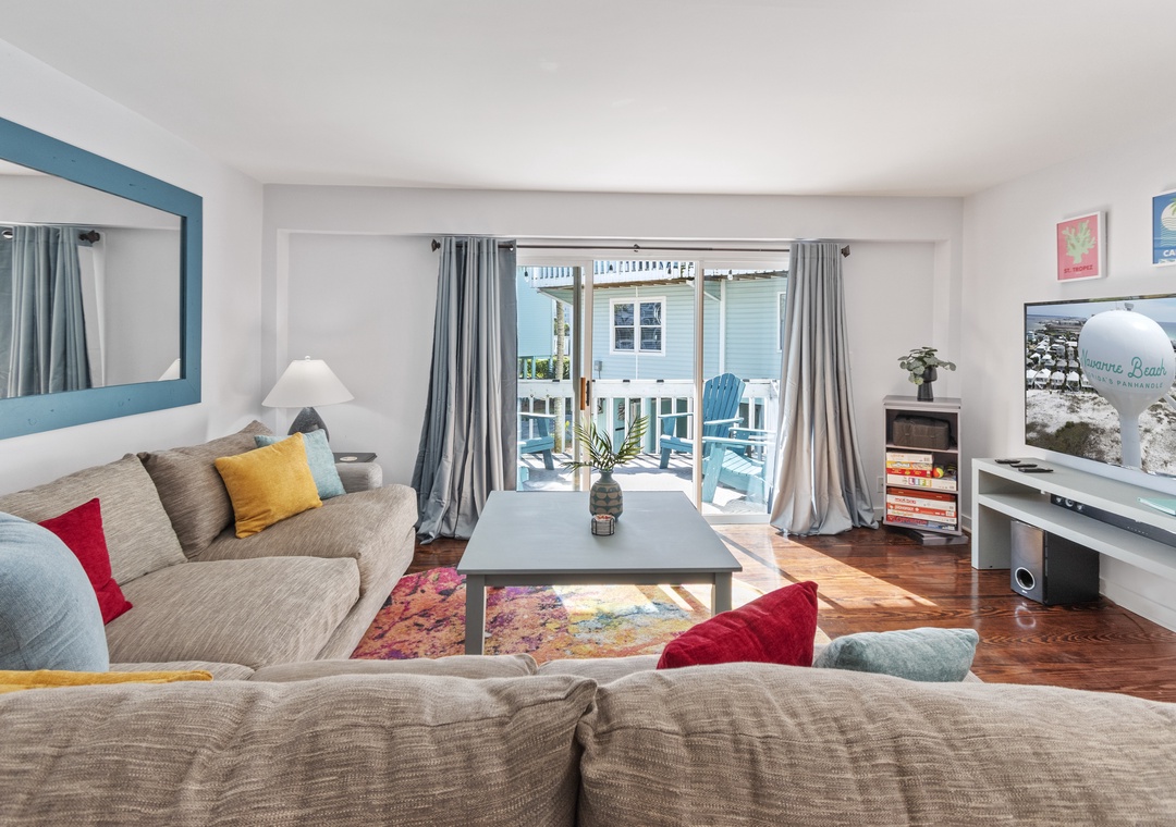 The main floor has a large comfy couch for TV viewing with sliders onto a deck for sunning, reading a book, or just relaxing. The dining table sits 6. The well equipped kitchen has a breakfast bar and everything you'll need for snack and meal making. There is also a back deck off the kitchen and a full bath with walk in shower on this floor.