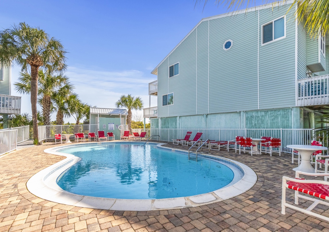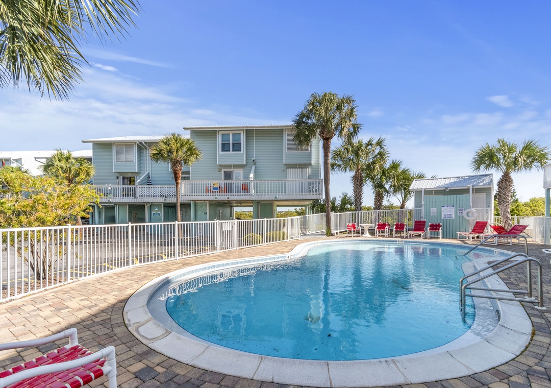 The heated community pool is just steps outside your door, with plenty of lounge chairs.