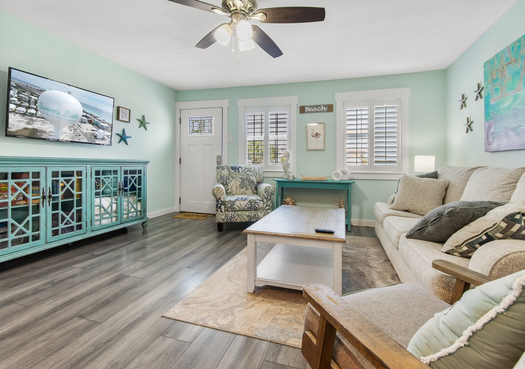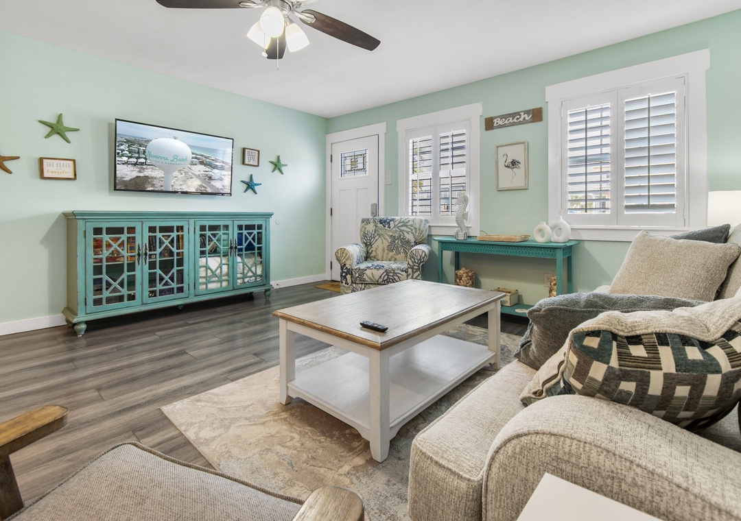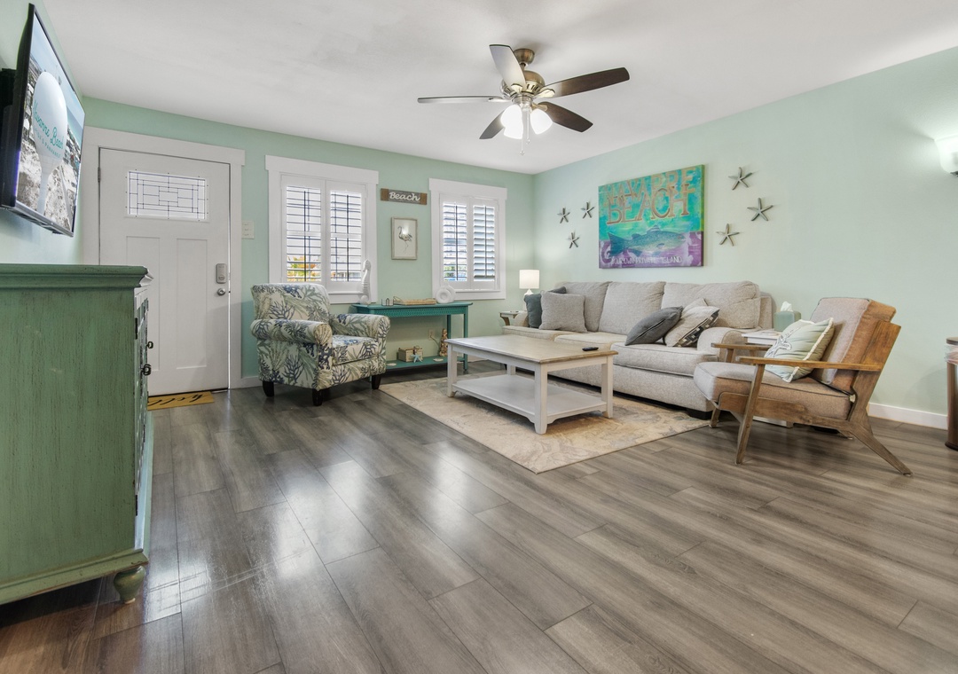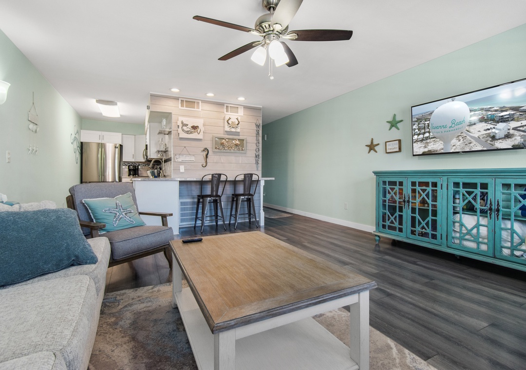 · Spacious Open-Concept Living Area with Sleeper Sofa & Brand New 75in Smart TV