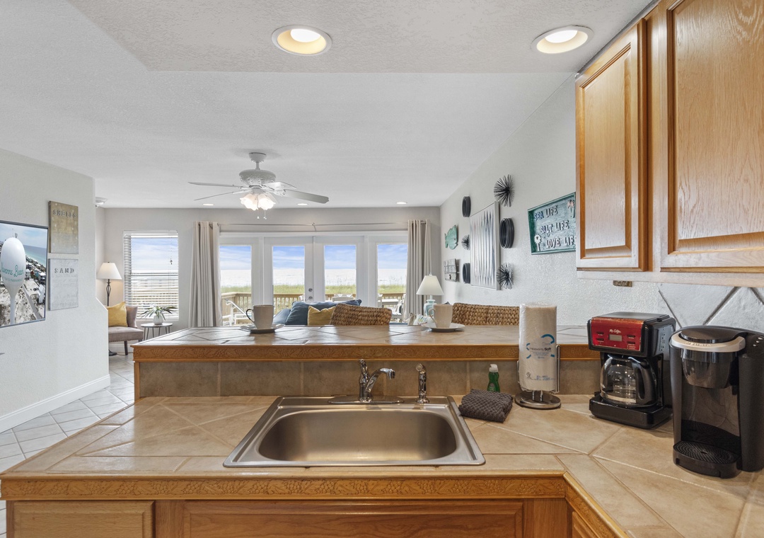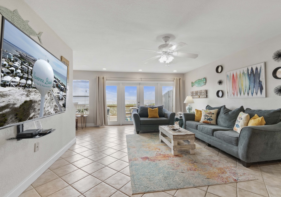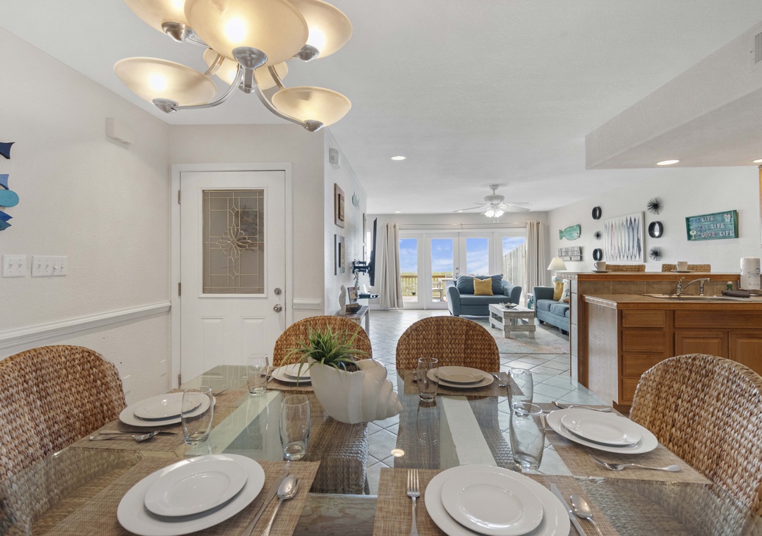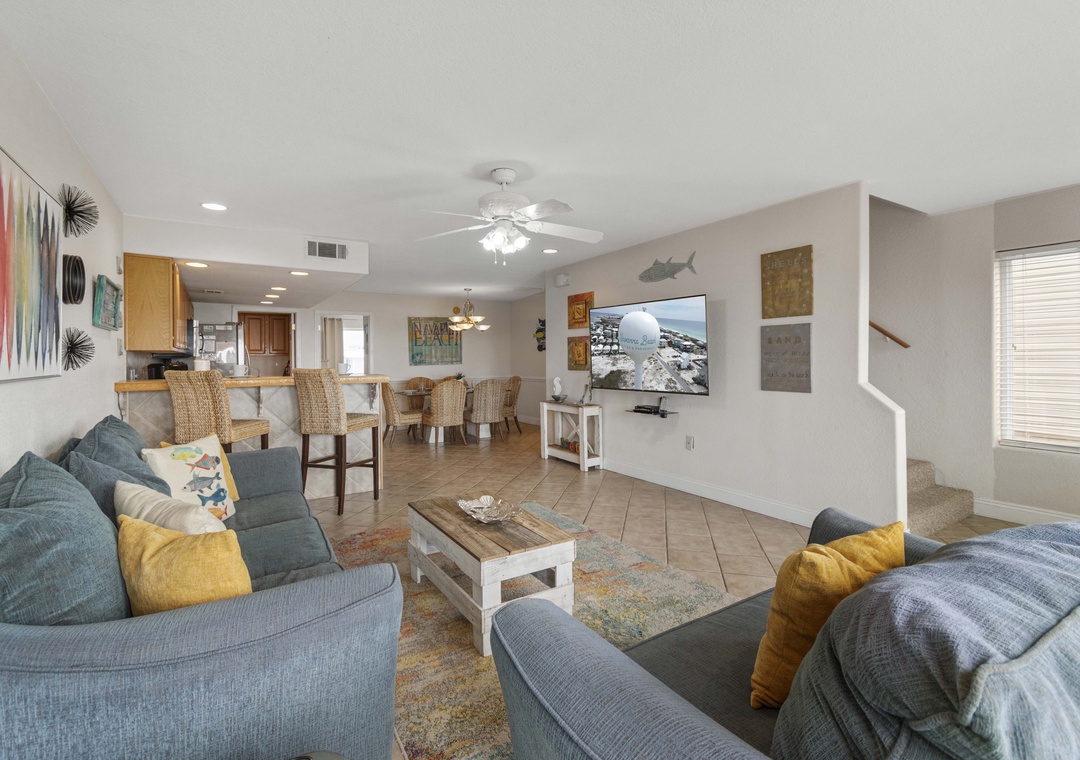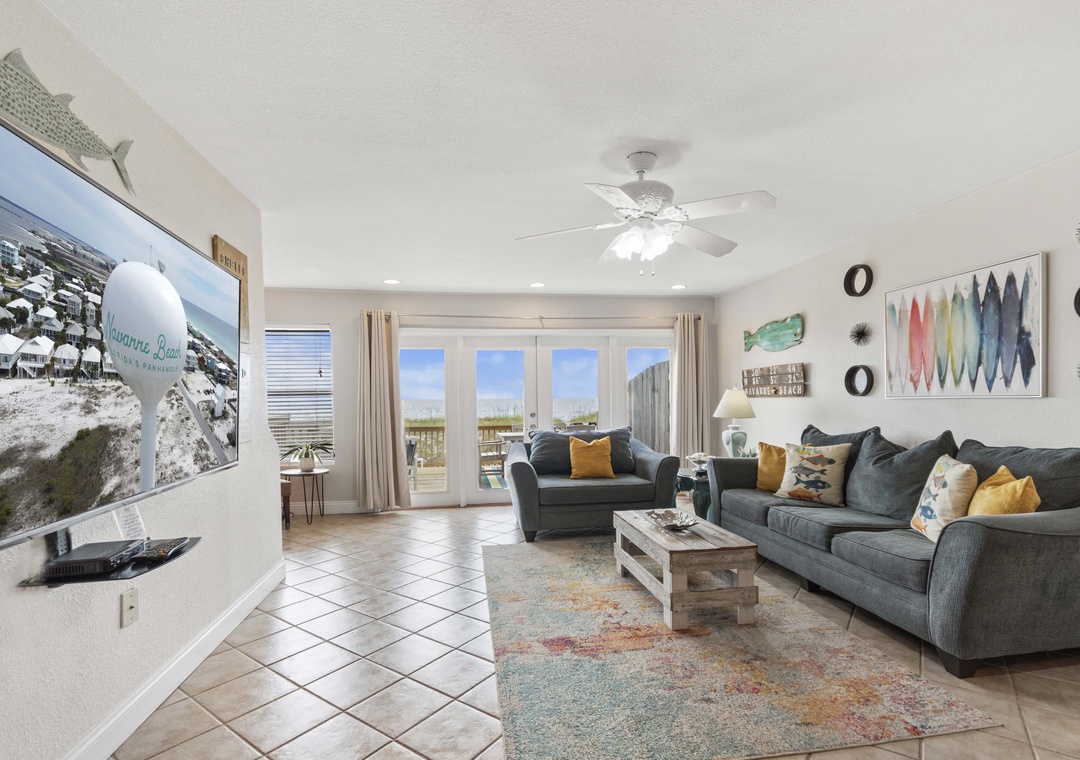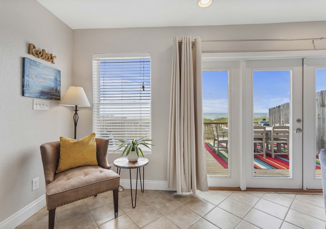 The large living area opens onto your own private deck. It's the perfect place to relax with a cool drink after spending the day swimming or shelling. Take a few steps off the deck and find your toes in the sand!