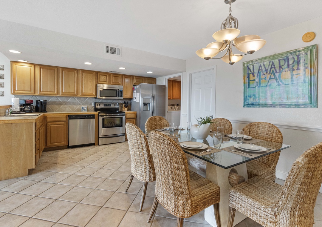 The kitchen is fully equipped for entertaining, with a large dining table and a breakfast bar. You can also grill out under the stars!