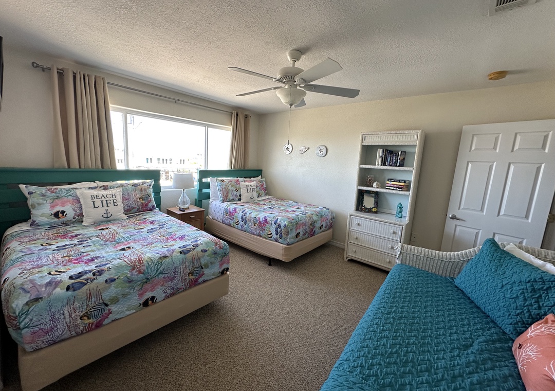 The first floor bedroom is queen-sized and the other second floor bedroom has a twin-sized trundle bed and 2 full-sized beds.