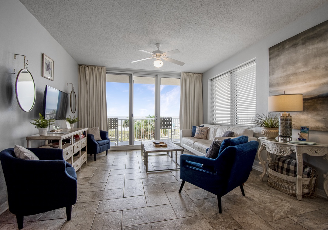 This beach front end unit has open concept living w/ endless views of the Gulf and sugar sand beach. Take in a beautiful sunrise or a winter sunset from your large private balcony while relaxing with a cool drink, reading a book or watching the seagulls soar by. You'll find comfortable living room furniture, flat screen TV, dining table for 6. breakfast bar for 3, and a well equipped kitchen with beautiful new granite countertops, stainless appliances and every gadget you'll need for snack or meal making.