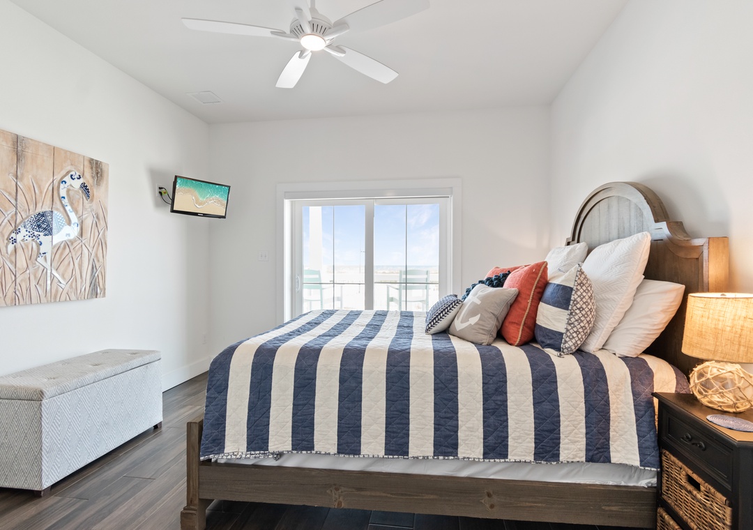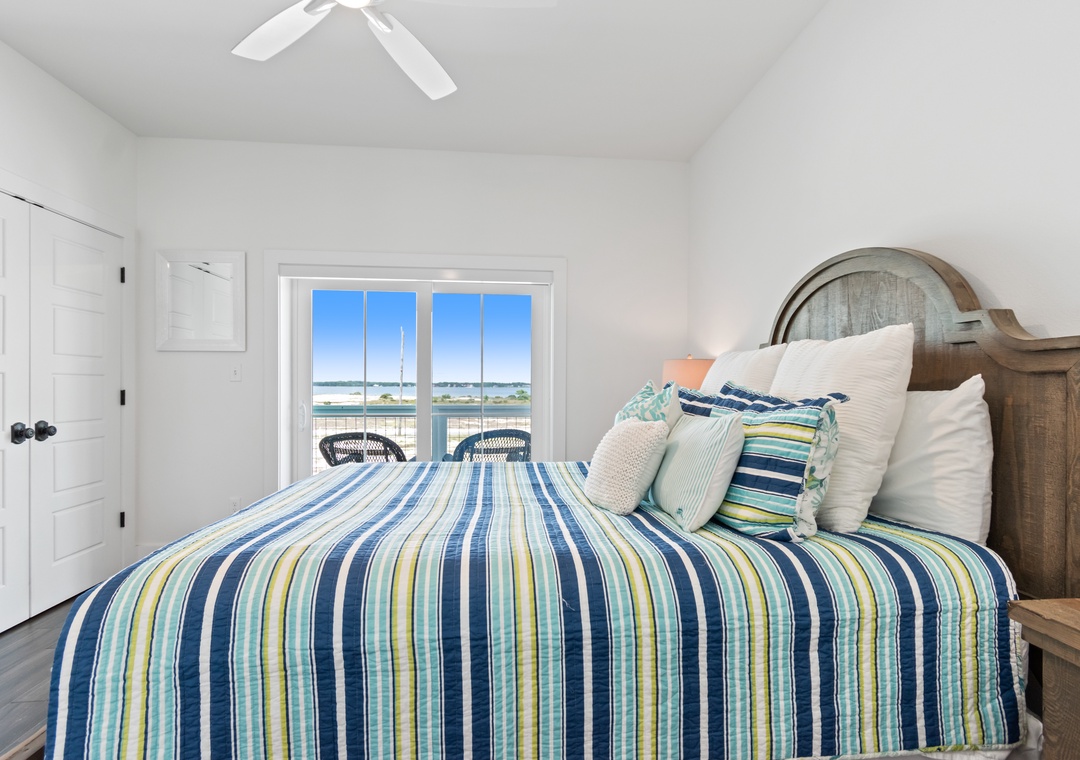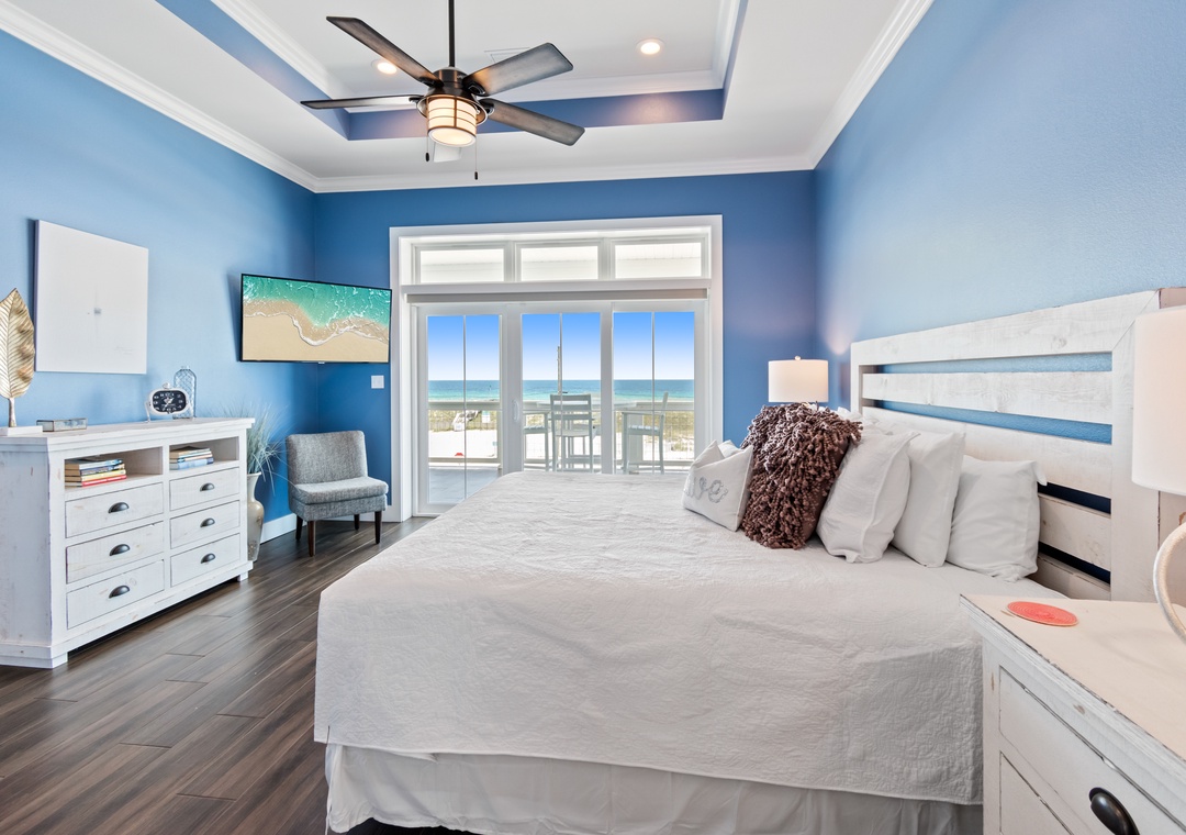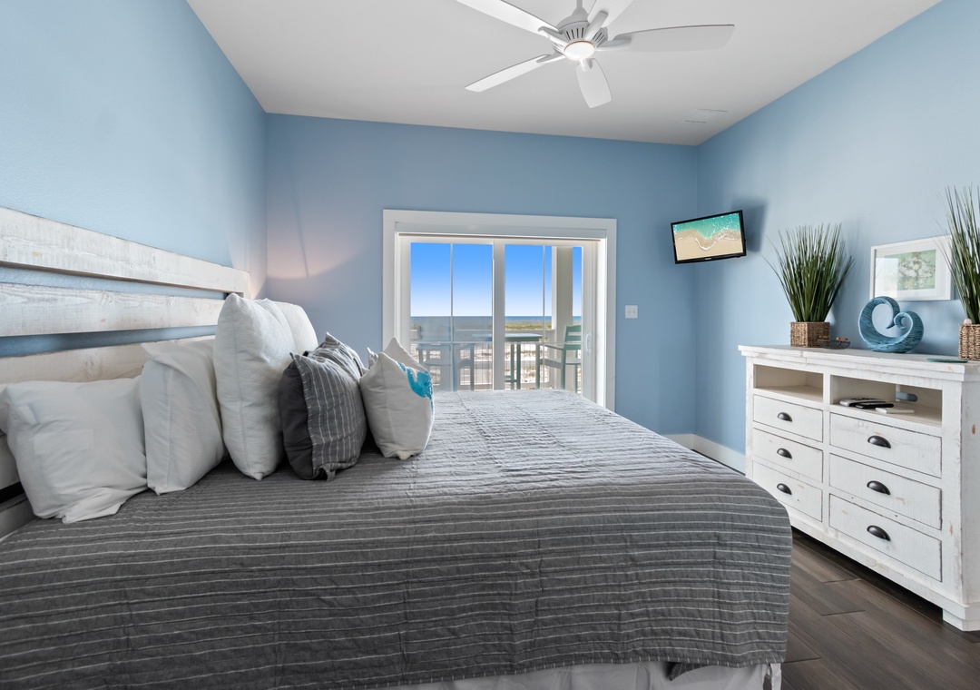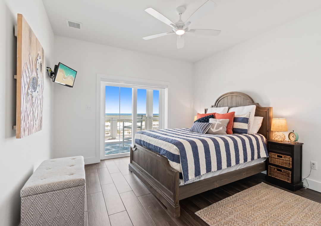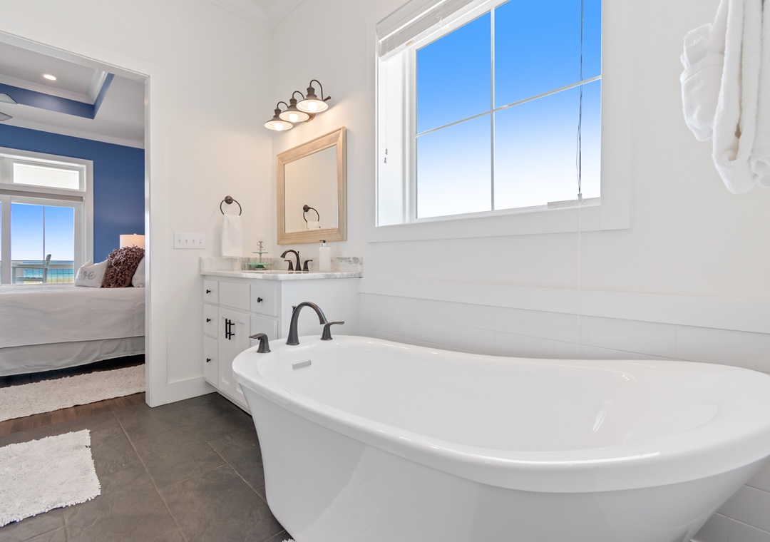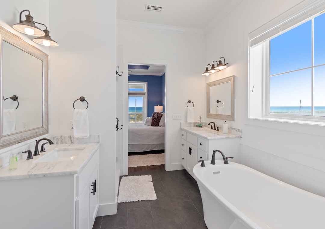 The king-sized primary bedroom with Gulf view deck and en suite bath is on this floor. A free-standing tub, tiled walk-in shower and dual vanities make this en suite a real spa experience.