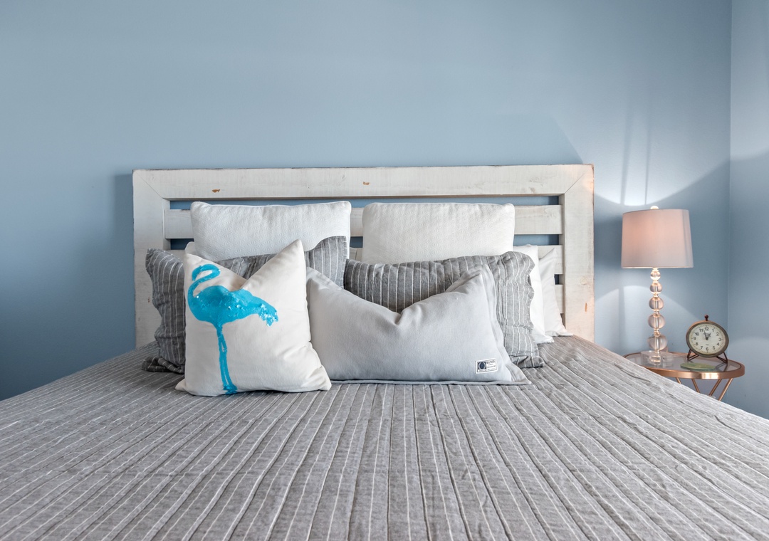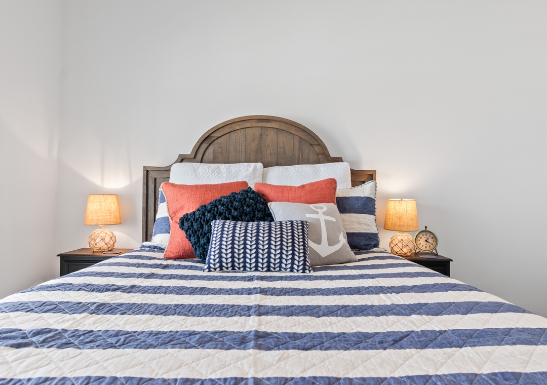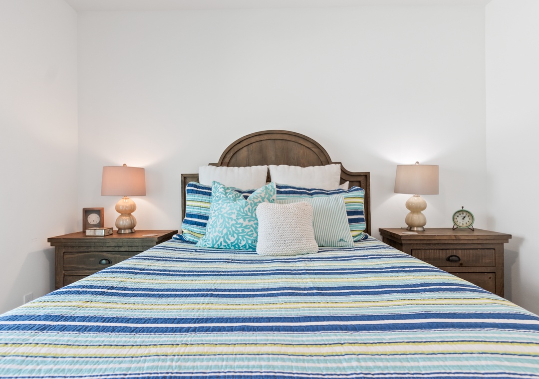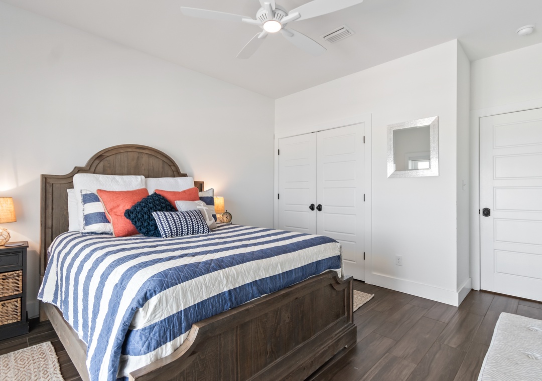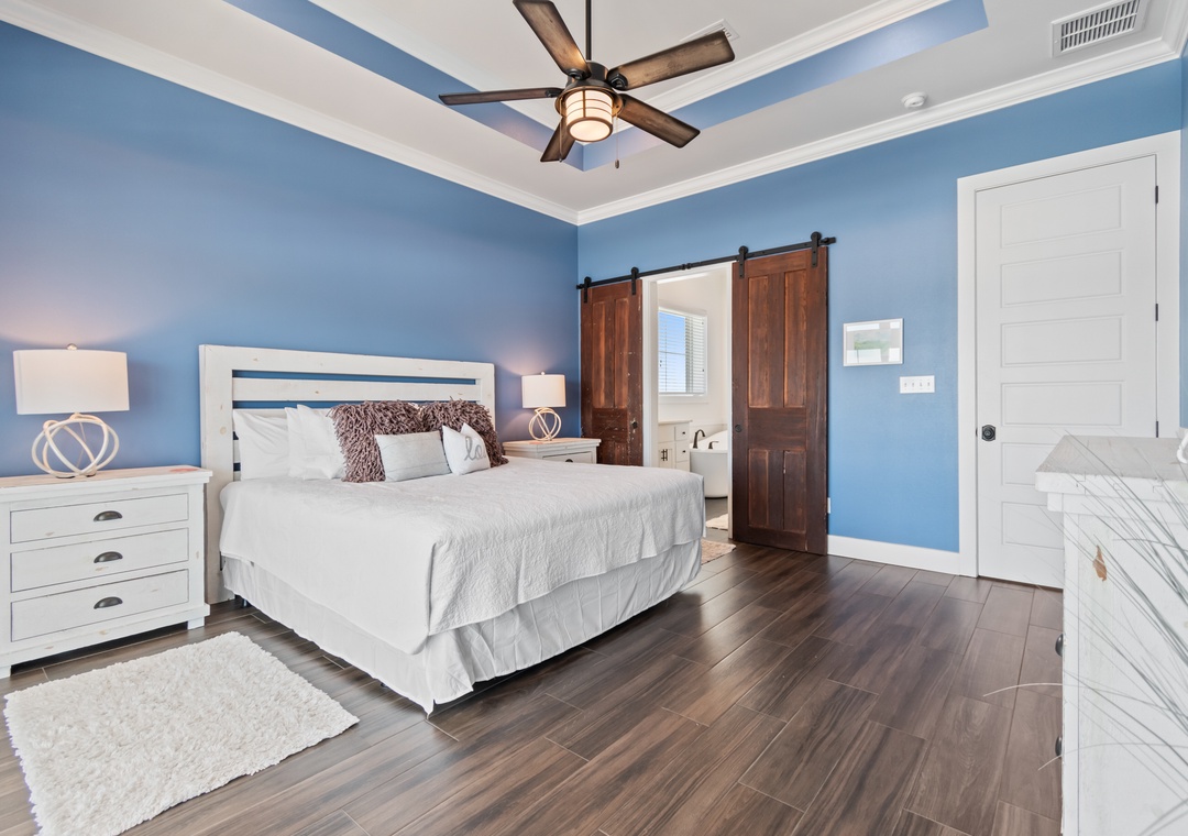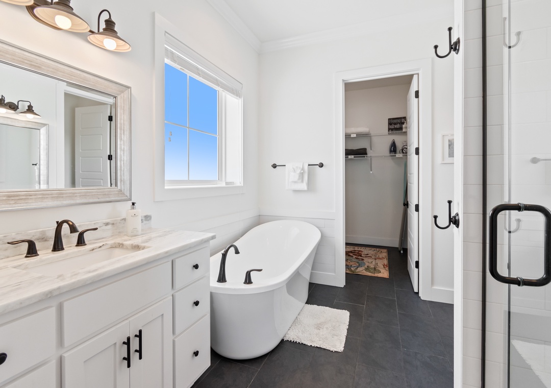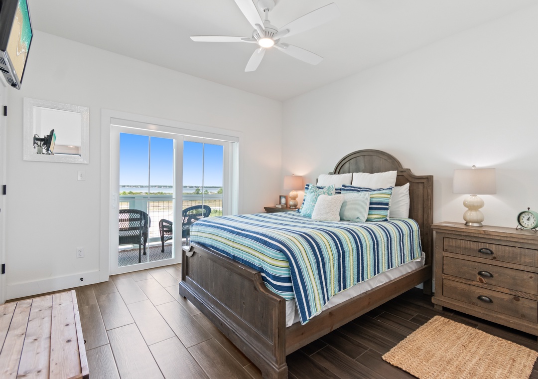 The king-sized primary bedroom with Gulf view deck and en suite bath is on this floor. A free-standing tub, tiled walk-in shower and dual vanities make this en suite a real spa experience.