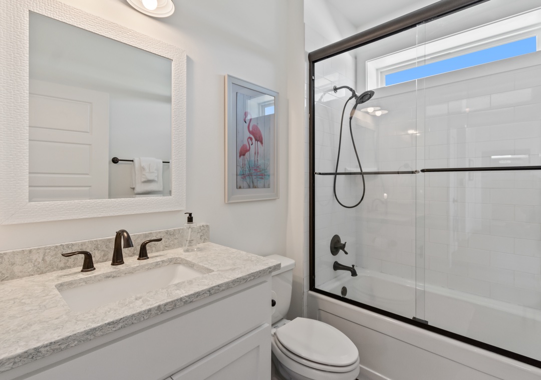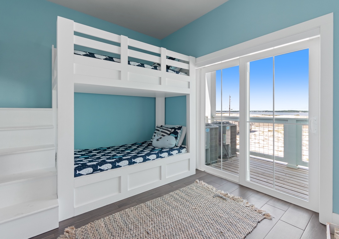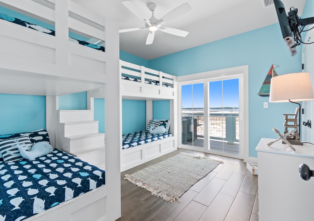 There are 4 bedrooms on this floor, two with a queen bed each, one with 2 sets of custom made bunks and a second king sized primary with gulf facing balcony. There are 2 bathrooms on this floor each with a tub/shower combination. Every bedroom has either a soundview or a Gulfview covered deck as well as a flat screen HD satelite TV.