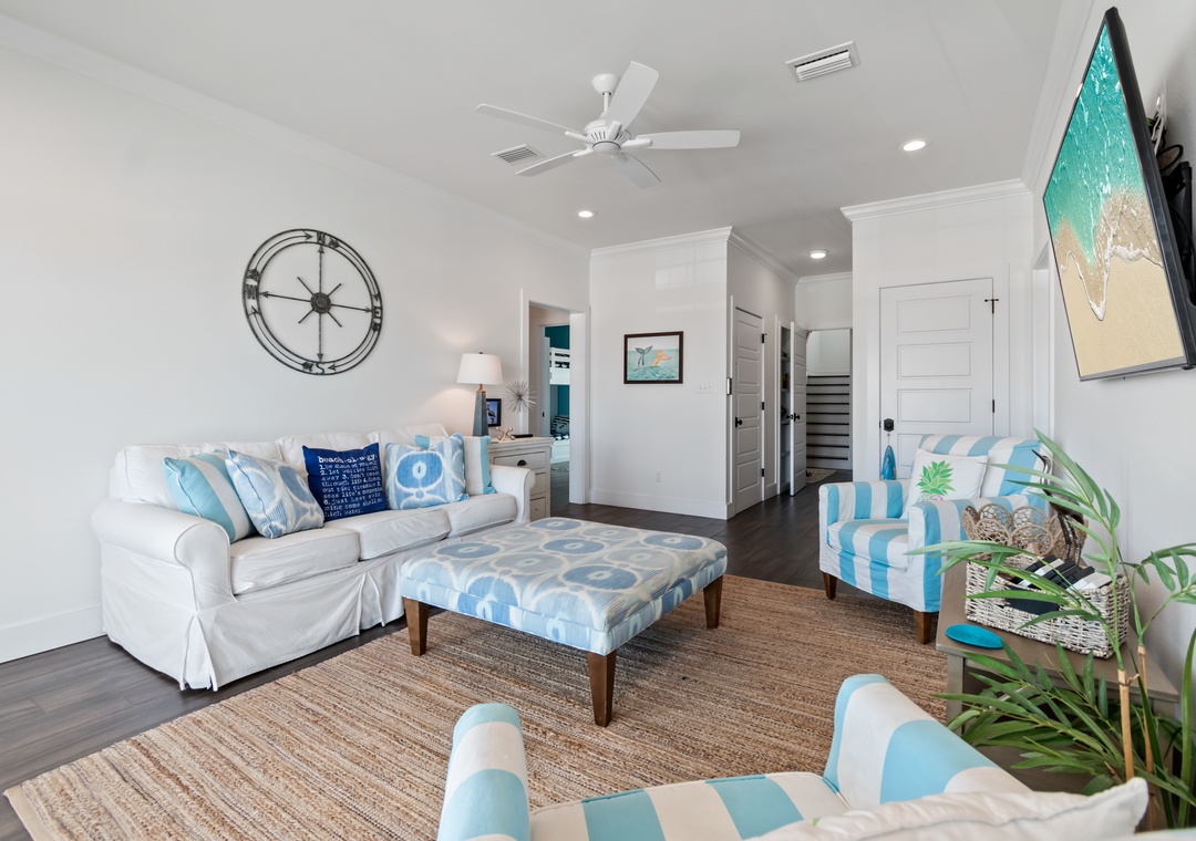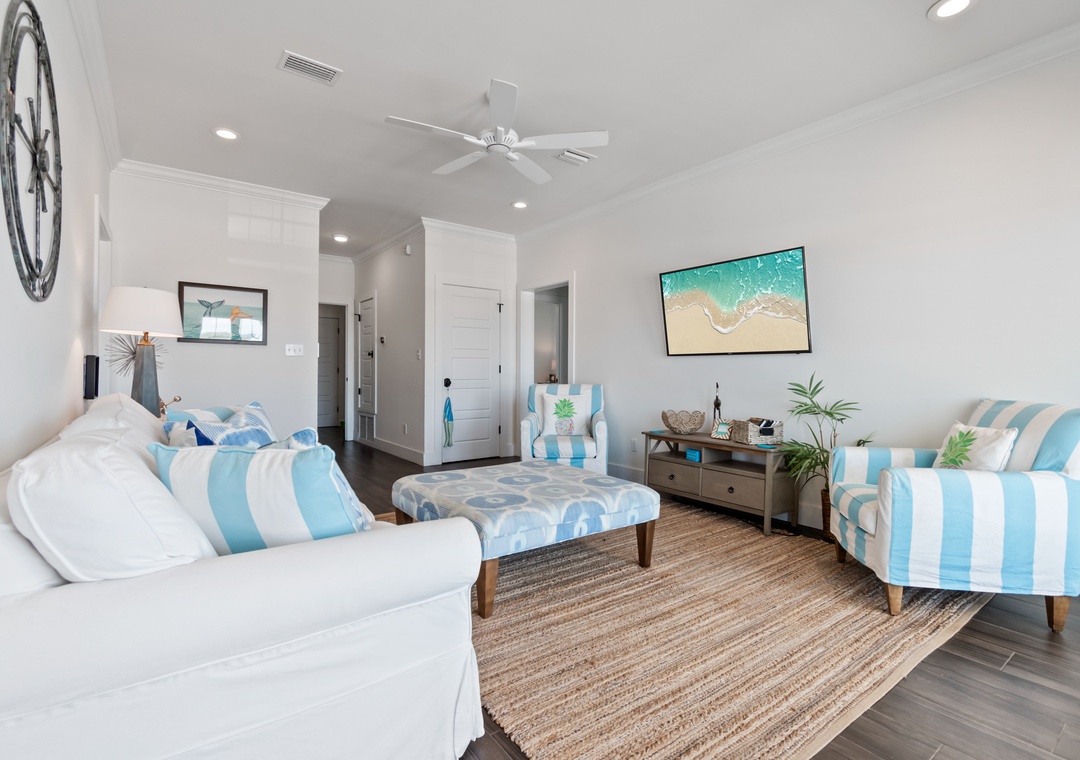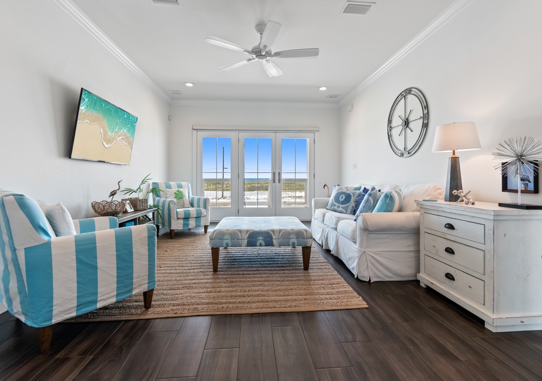 Upon entering on the main floor, you'll find a den with large flat screen TV and comfortable seating. This is a great "hideaway" spot to play a game, read a book or watch your favorite TV show while gazing at the Gulf. The first of 2 sleeper sofas is here.