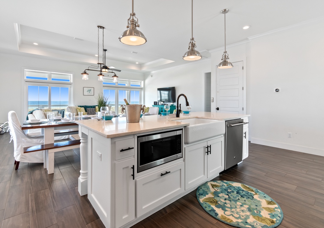 Up one flight is the large open concept great room where you'll find a large gourmet kitchen, dining table seating 12, breakfast bar seating 4 and large living area with more comfortable seating and flat screen TV. The second sofa sleeper is here.