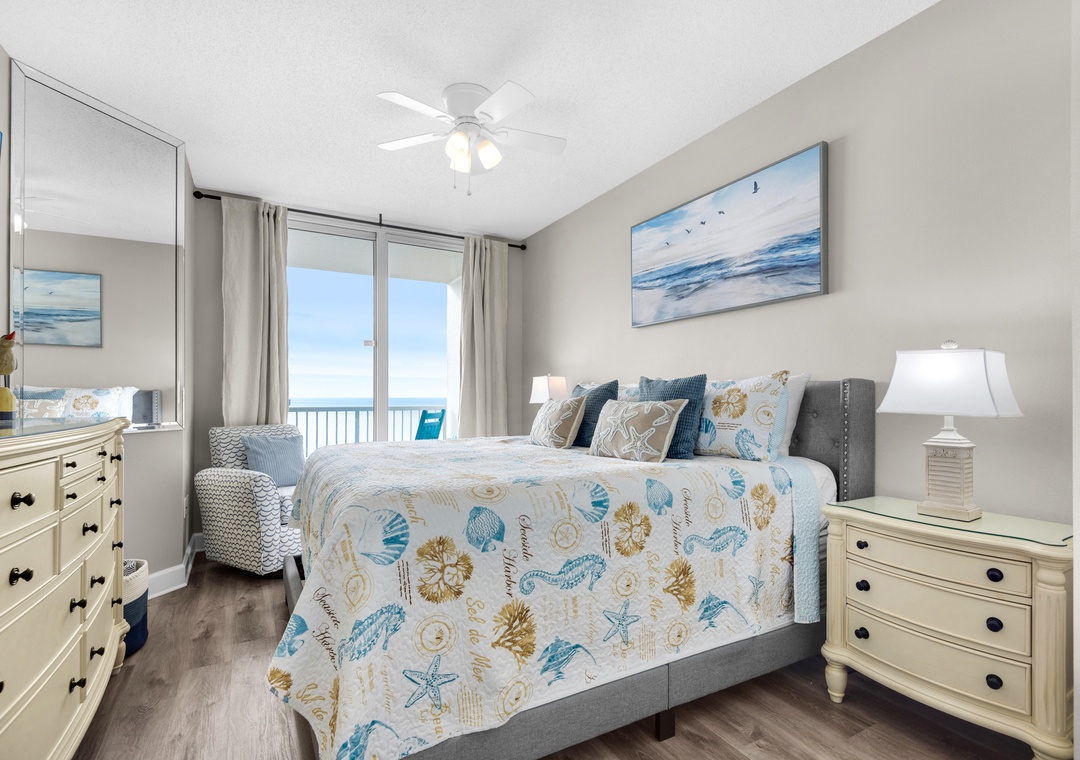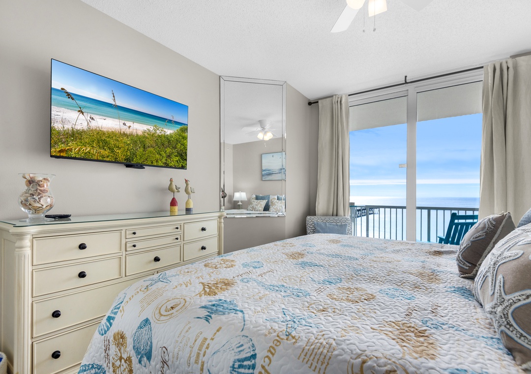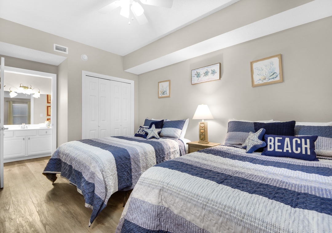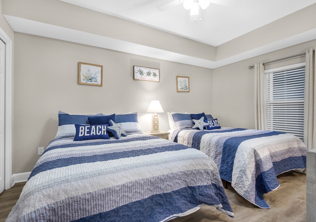 This condo has a primary king bed suite, with an attached bathroom, gulf beach views, and direct balcony access. In the first guest bedroom, you will find two queen beds, and in the second guest bedroom, you will find a twin-over-full bed.