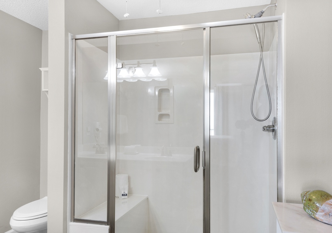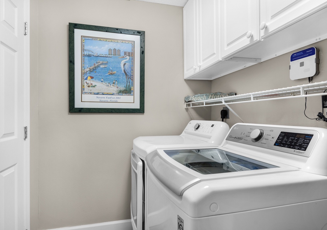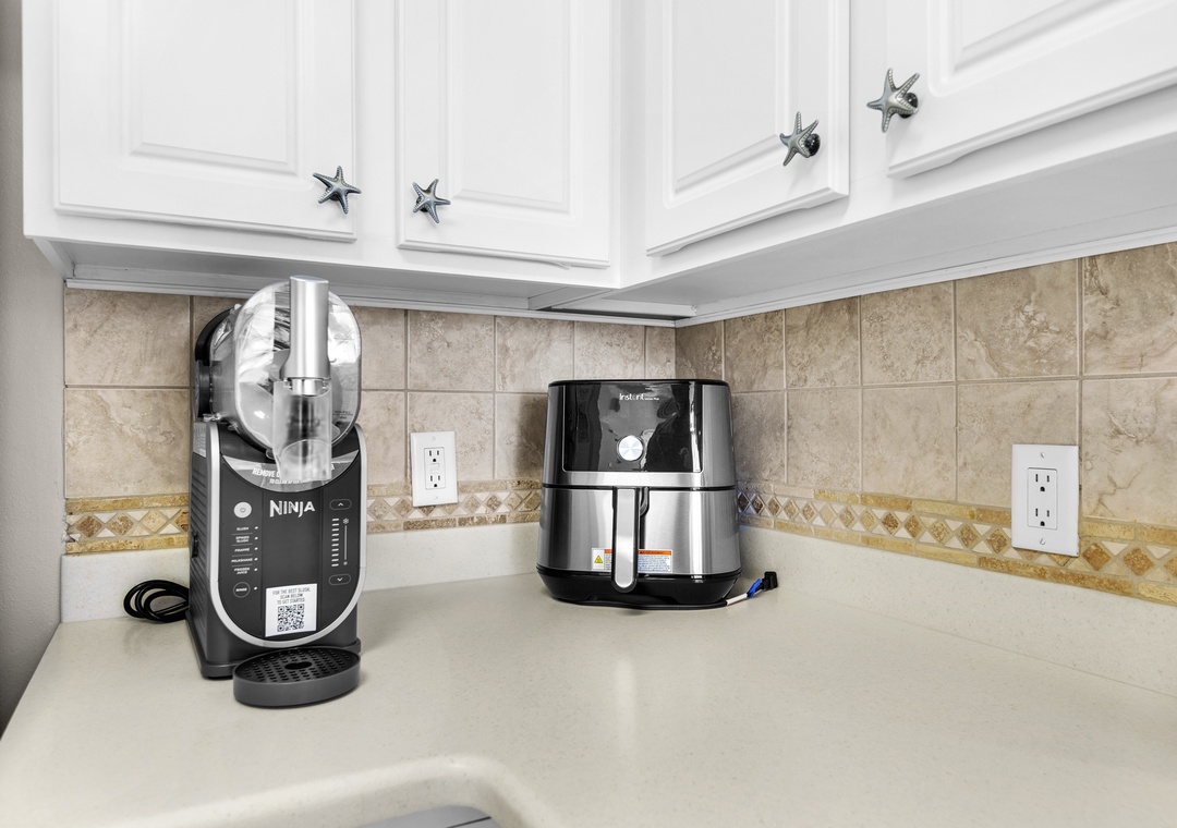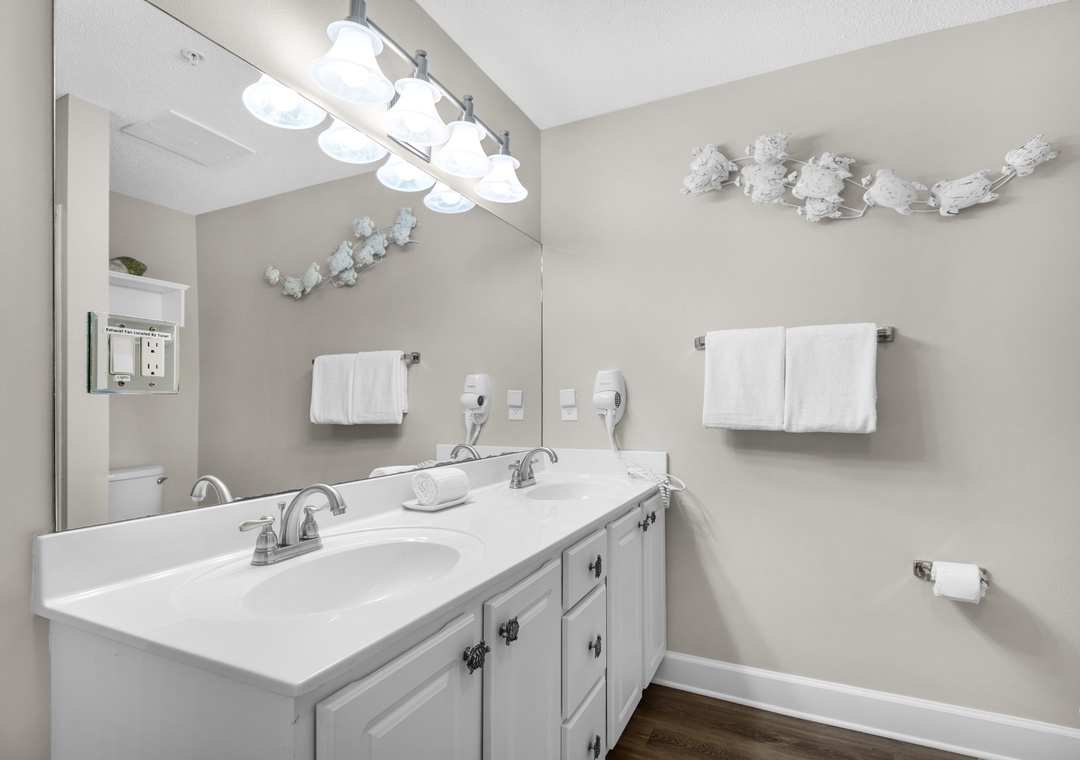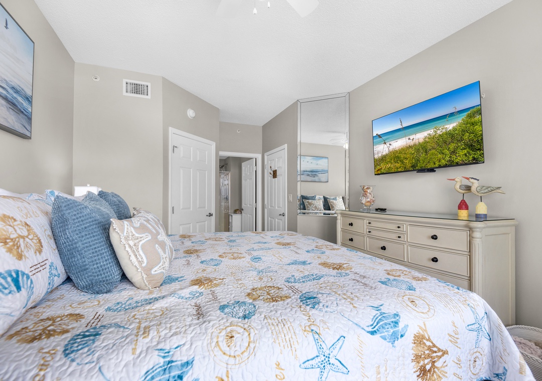 This condo has a primary king bed suite, with an attached bathroom, gulf beach views, and direct balcony access. In the first guest bedroom, you will find two queen beds, and in the second guest bedroom, you will find a twin-over-full bed.