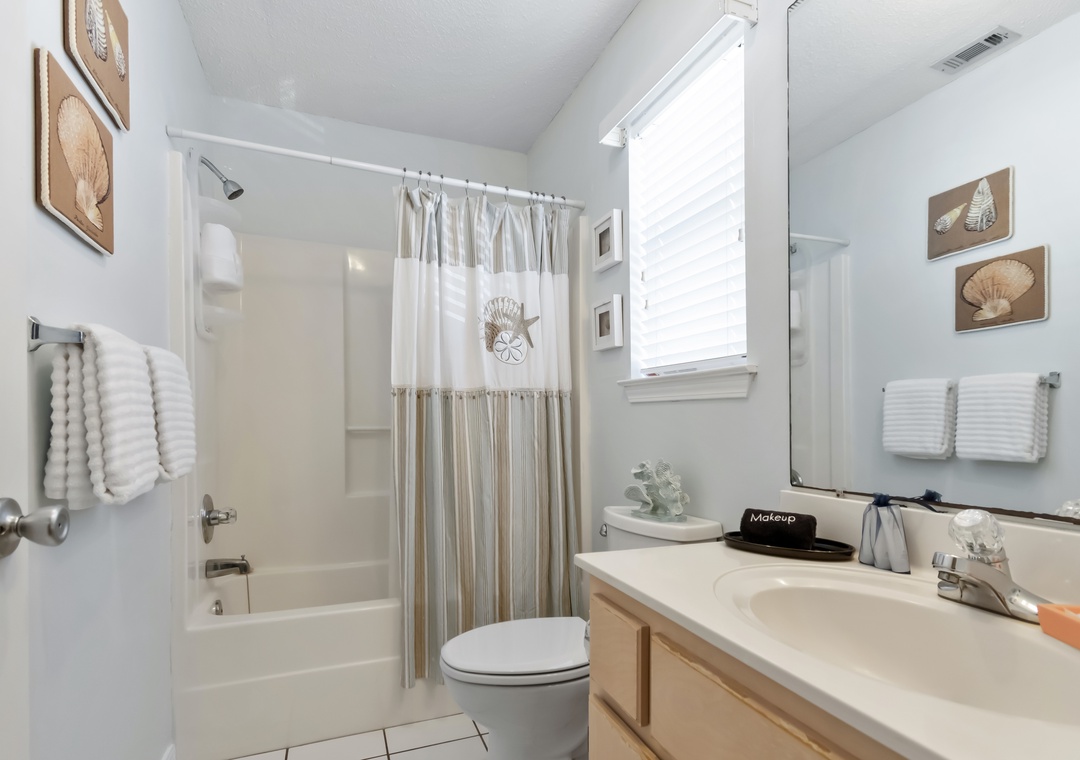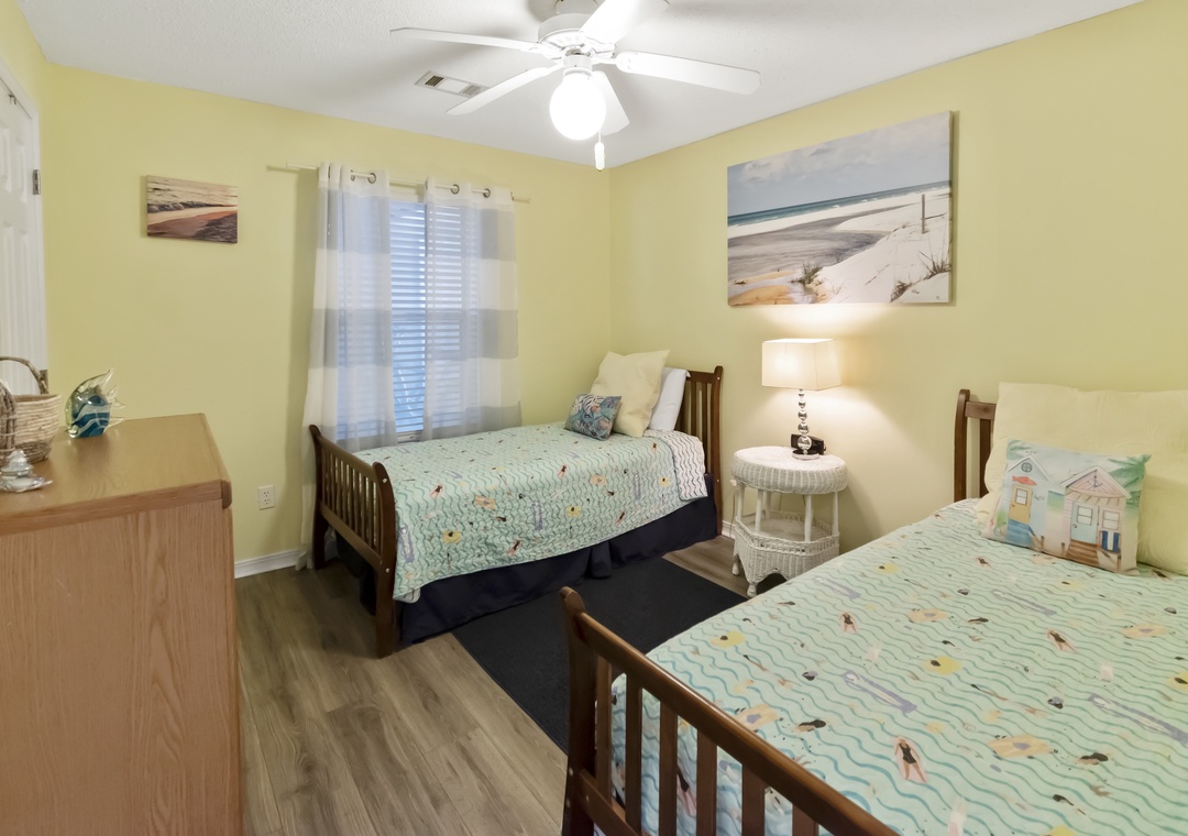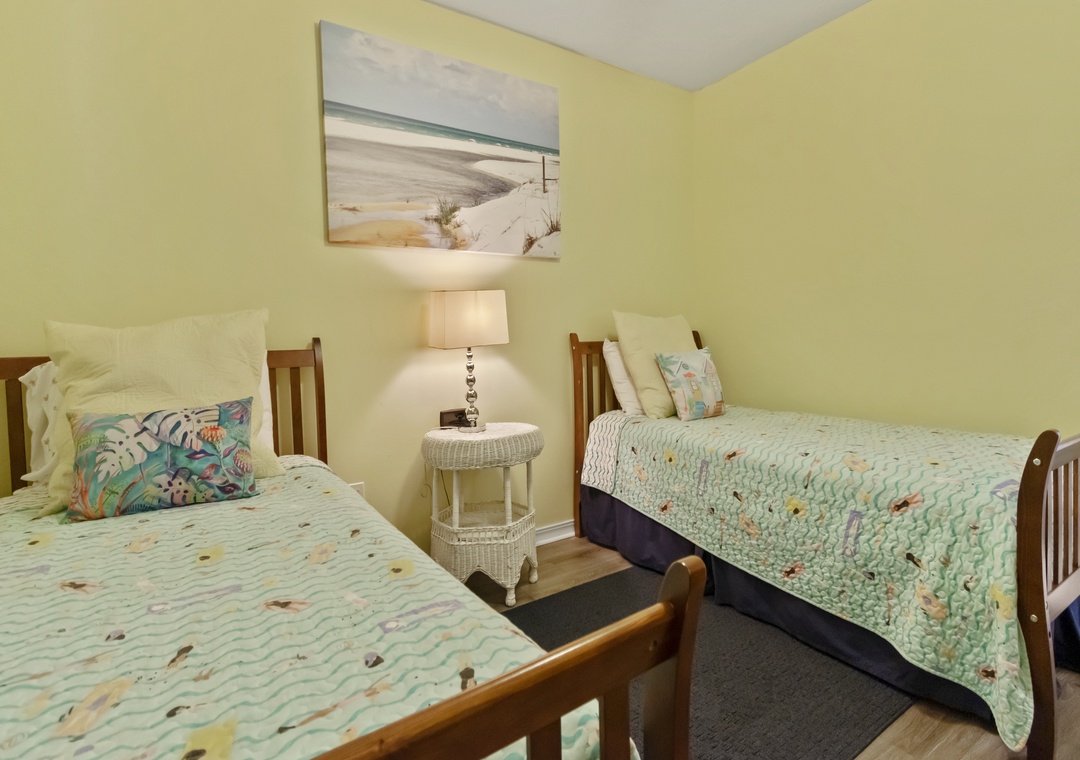 The queen-sized primary bedroom has an ensuite bath with tub/shower combo. The second bedroom has two twin beds and there is an additional bath with walk in shower off the hall.