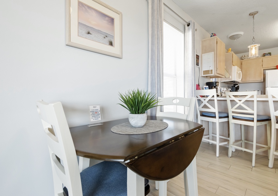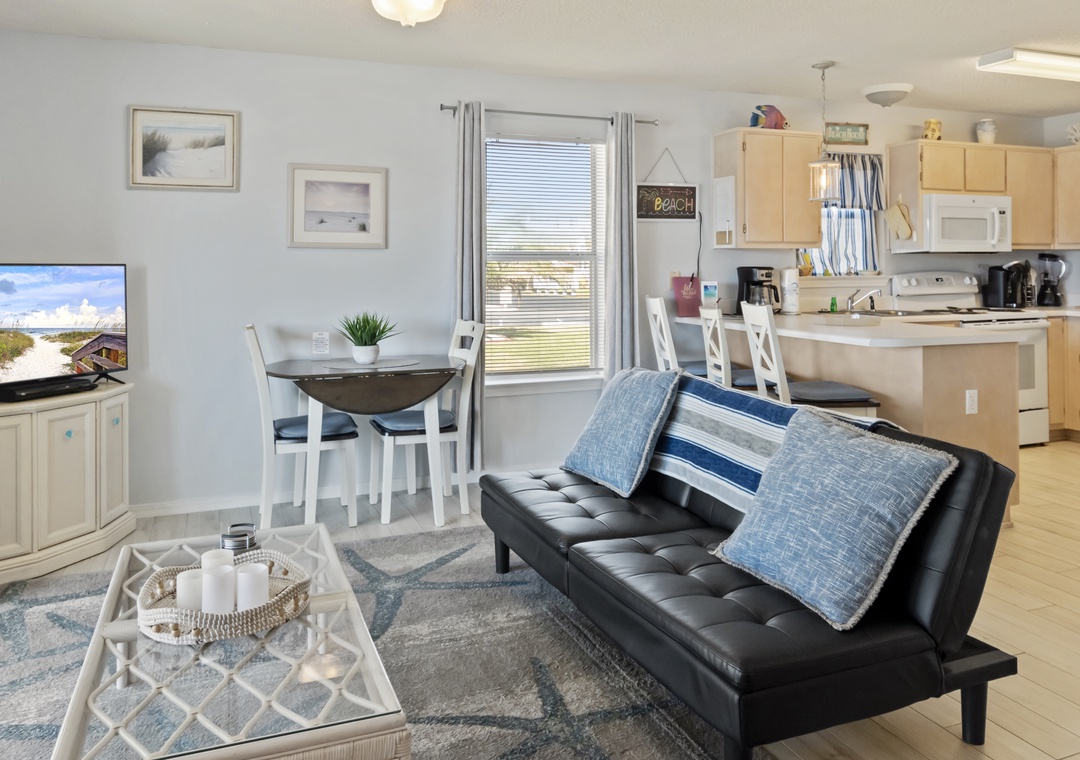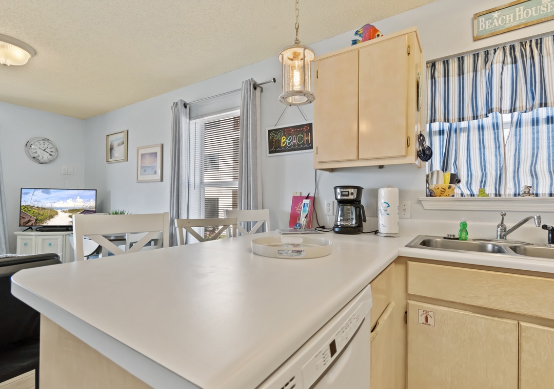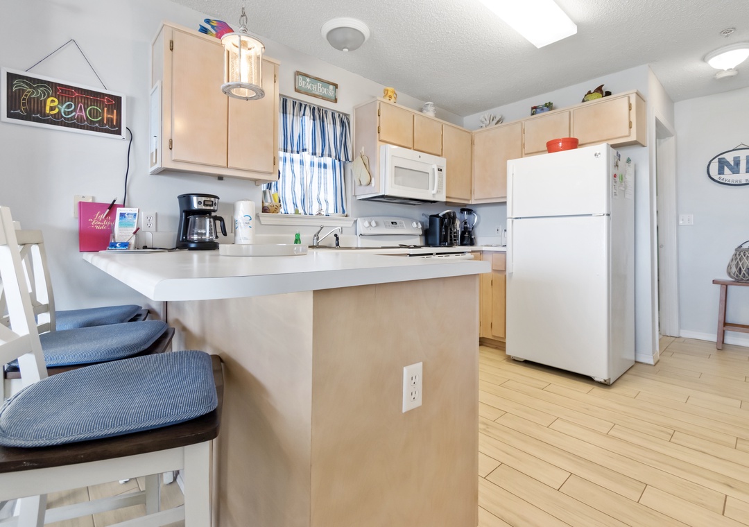 The kitchen is fully equipped for you to make snacks after beachtime or dinner after pooltime. A breakfast bar seats 3 and the dining table an additional 2.
