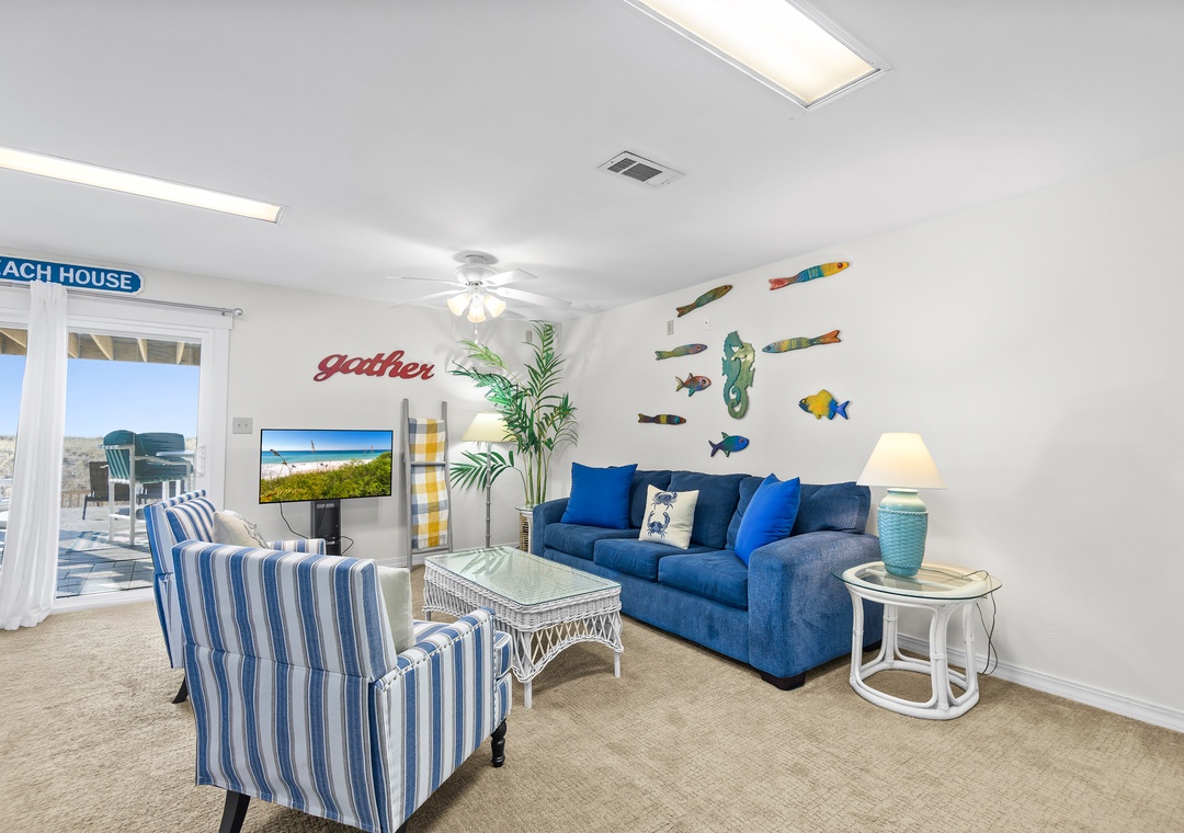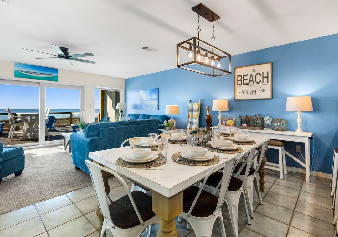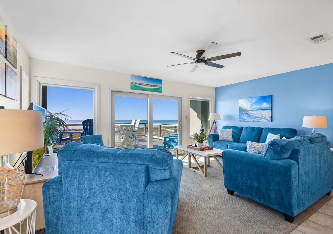 Recently renovated, the main floor is open concept living with Gulf views from every spot. Offering comfortable seating for TV or Gulf viewing, a dining area seating 6 and a well equipped kitchen for snacking or making a meal, it's a great gathering spot for your group. All furniture is new. The huge brand new Gulf front deck is just outside , perfect for dining, grilling (gas), lounging or sunbathing. There is also a large bedroom with 2 queen-sized beds, new carpeting and full bath on this floor.