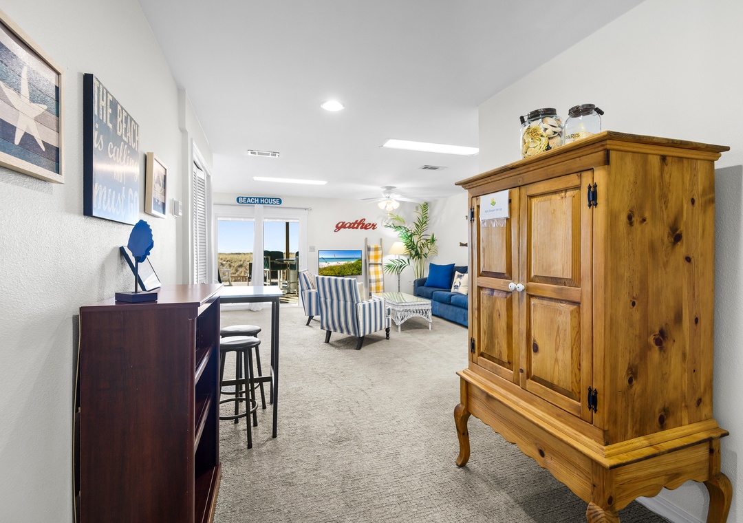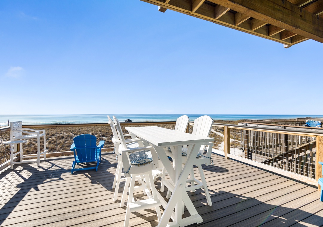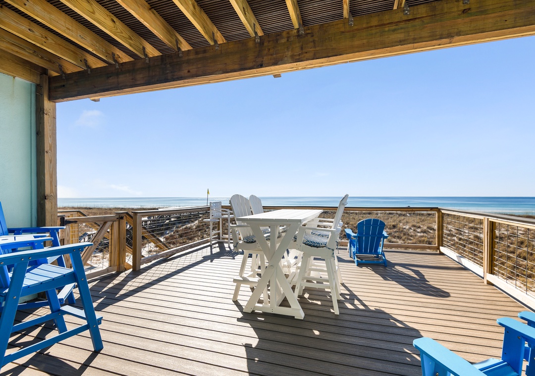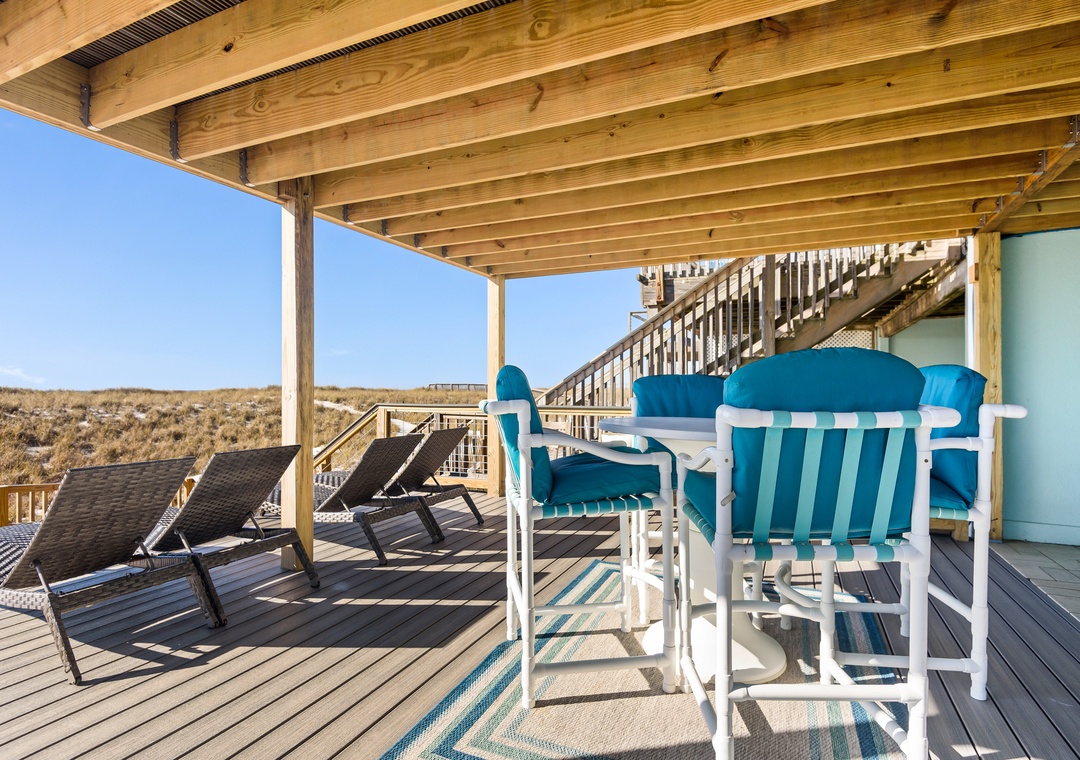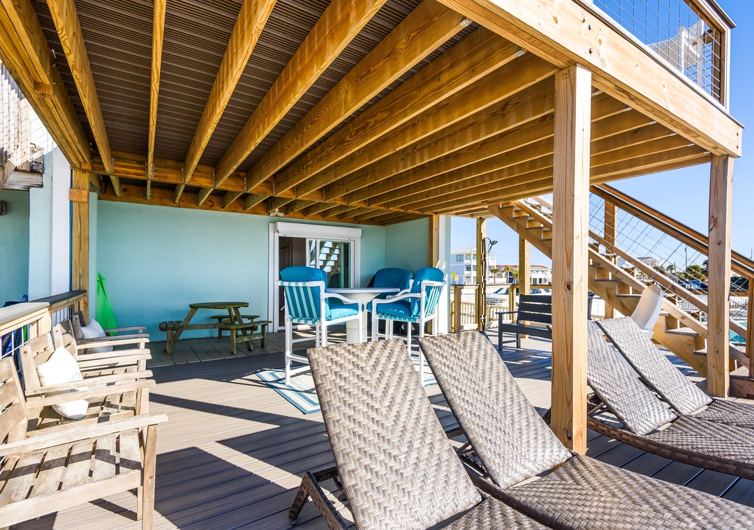 After your day in the sand, rinse off under the outdoor shower on the lower deck. Sort your shells and take a break from the sun in this shaded ground area.