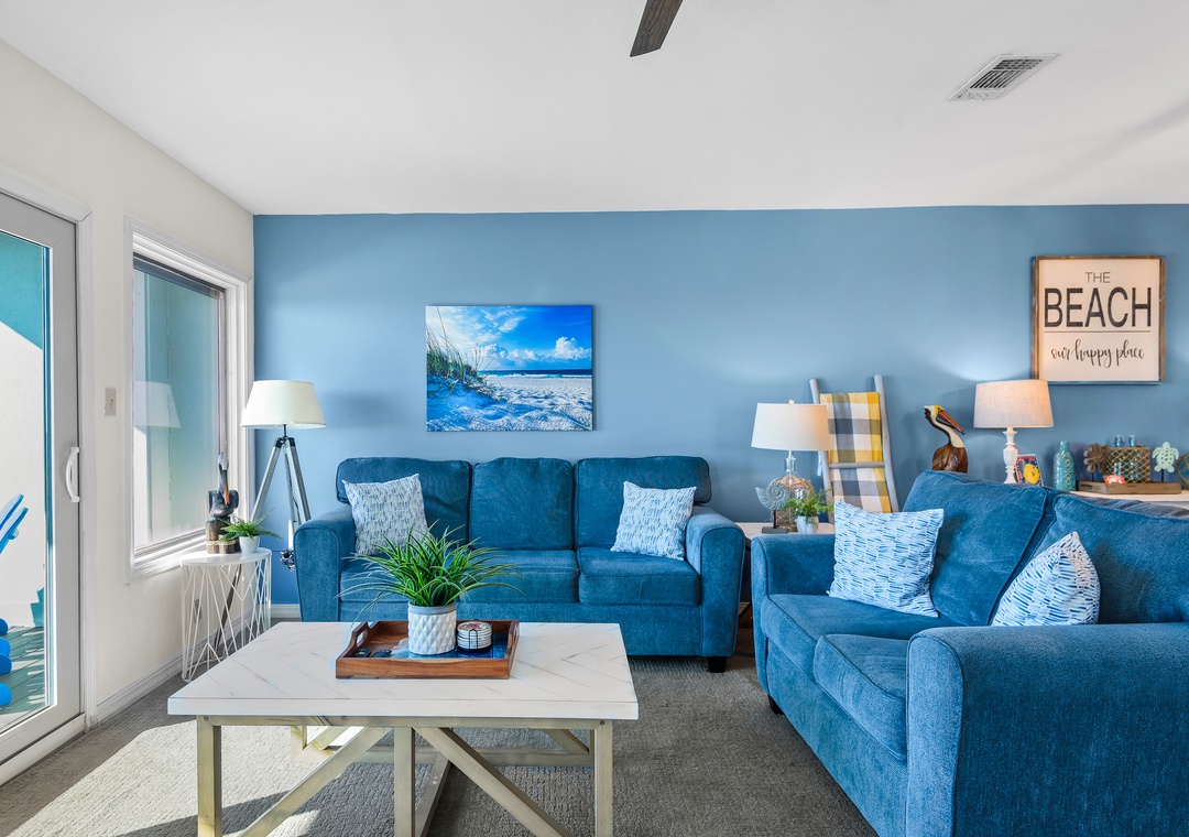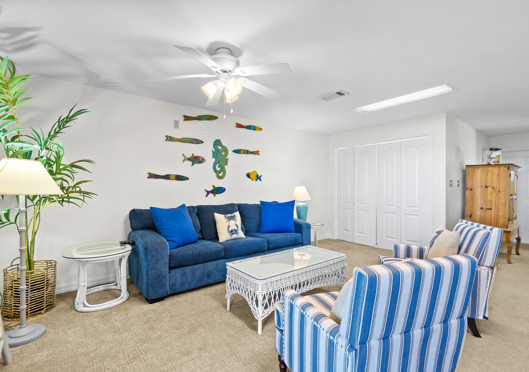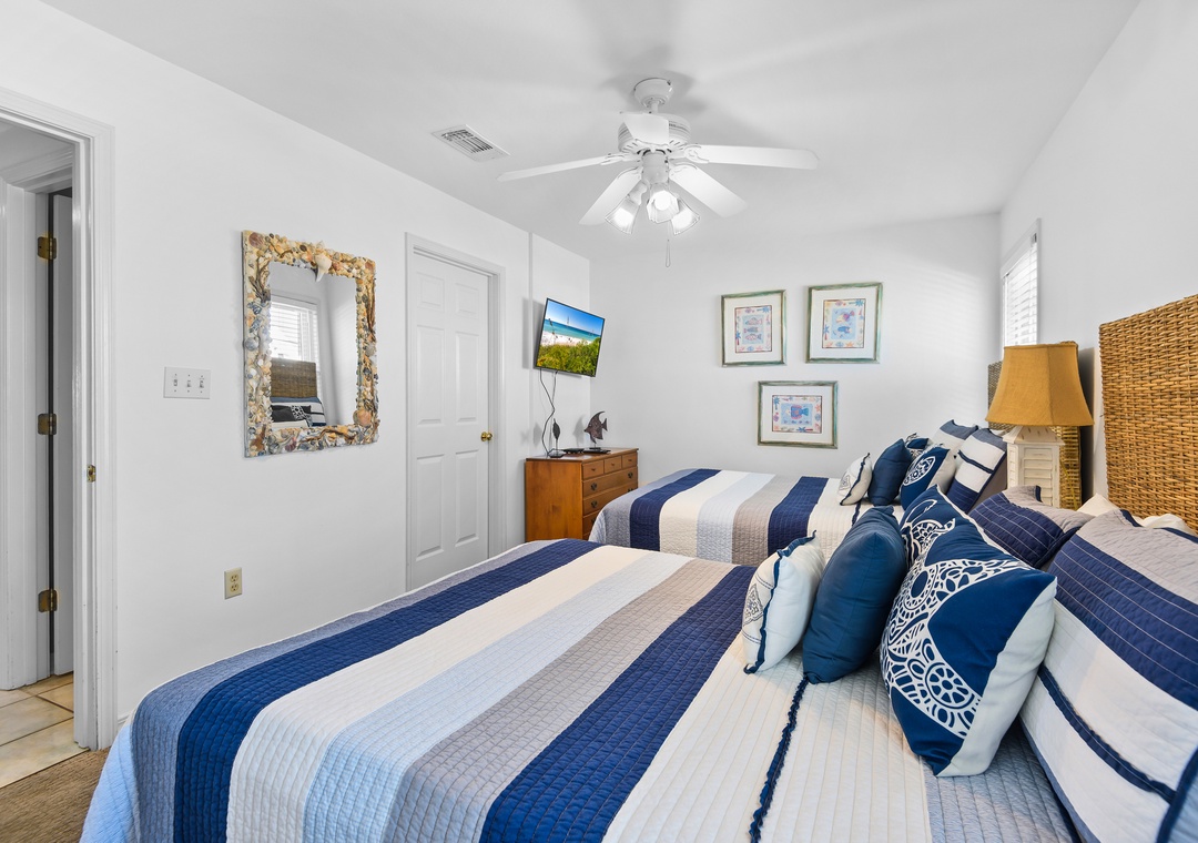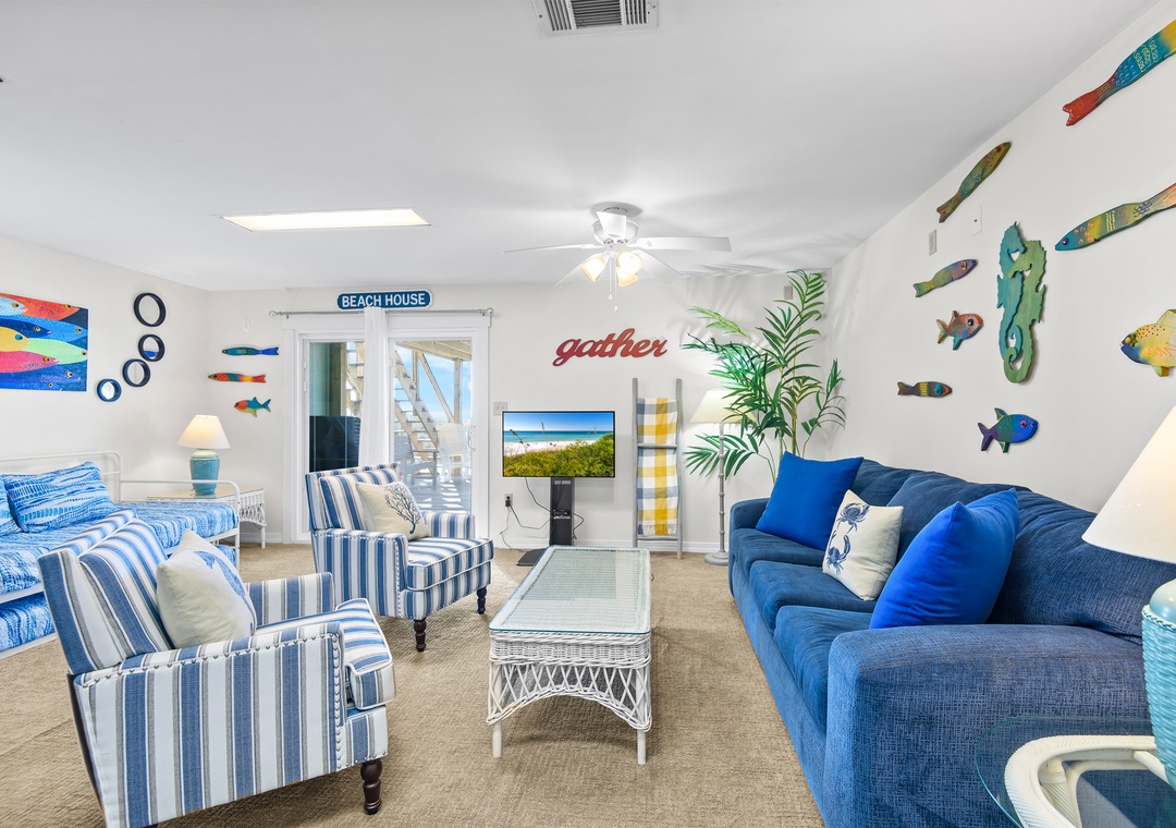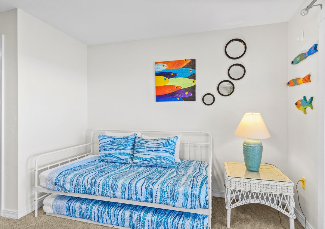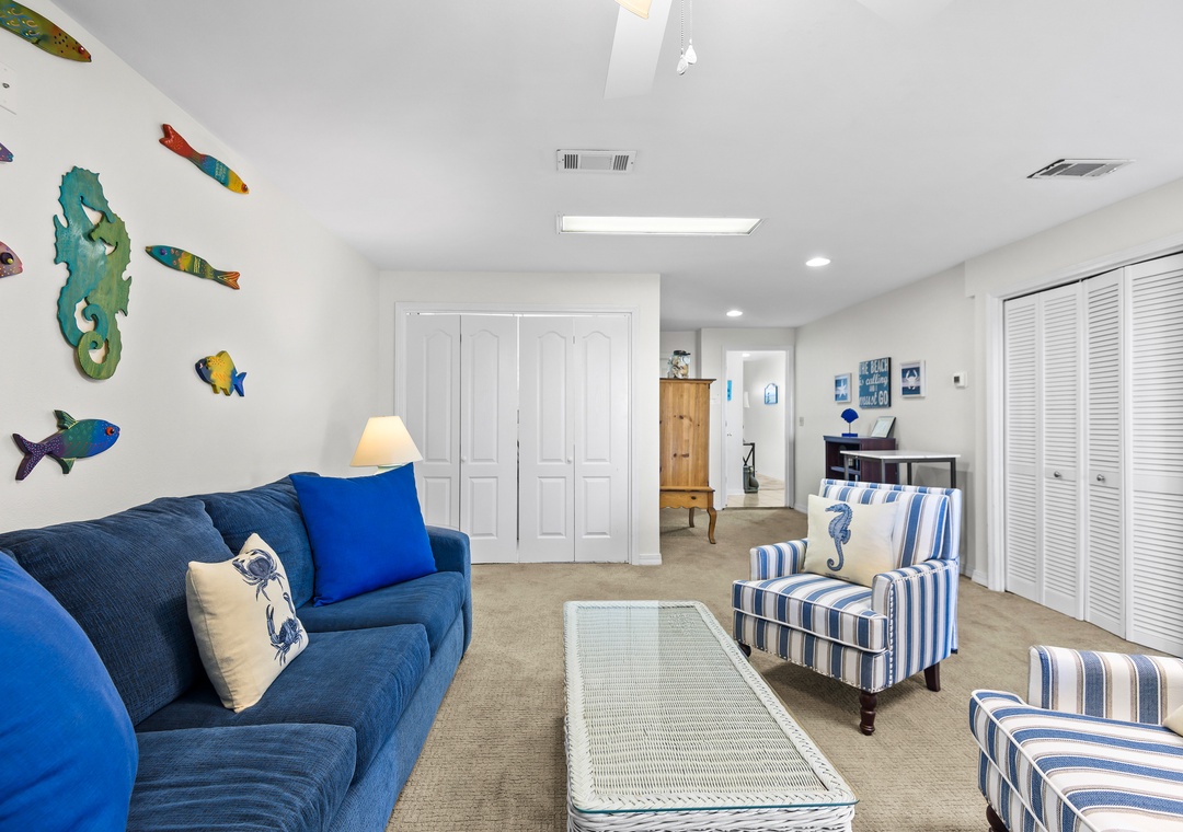 The fourth bedroom is located on the ground floor and is a great private escape. There is a trundle bed and a sleeper sofa as well as new carpeting, full bath, large flat screen TV and sliding doors out to one of 3 gulf front decks. This room can comfortably accommodate 4 for sleeping.