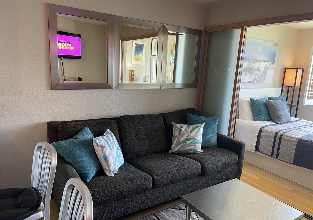 Relax in this sound front studio retreat which offers sleeping for 4. The custom slider creates a private queen-sized bedroom, and there is a comfy full-sized sleeper sofa in the living area.