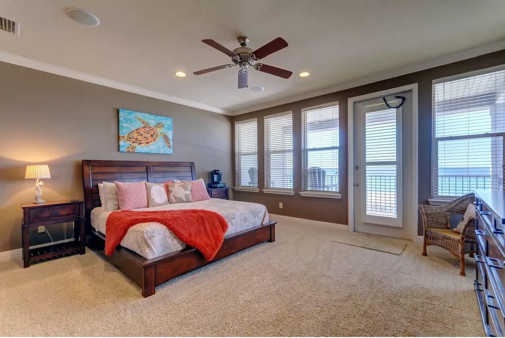 Upstairs you'll find the king-sized primary bedroom with en suite bathroom which includes a jetted soaking tub, separate walk in shower, double sinks/vanities and a private water closet. The large private balcony off the master is the perfect spot to watch a spectacular sun or moon rise over the gulf. There is also a coffee station here for your first cup in the morning!