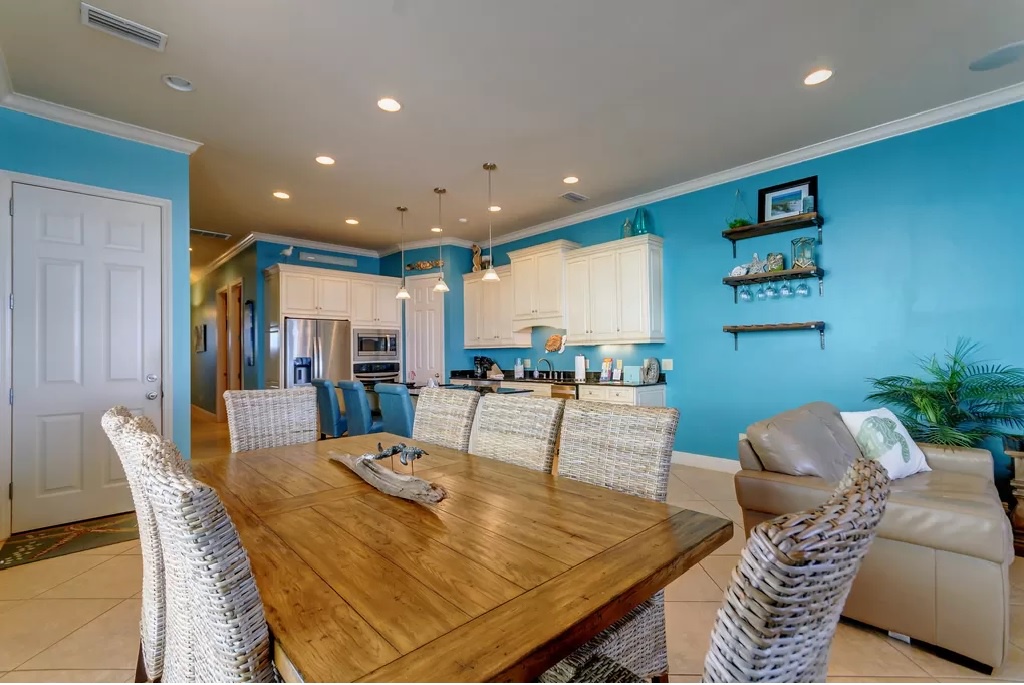 Open concept living in the huge great room allows for your entire group to gather while watching the 55" flat screen TV, cooking, dining, playing games or just relaxing. Watch the turtles swim by, the dolphins play and the seagulls soar from the comfort of the living area or from one of 2 spacious balconies.